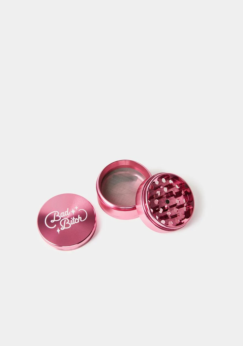 has a metallic pink design, 3 compartments, and comes with a small spatula.