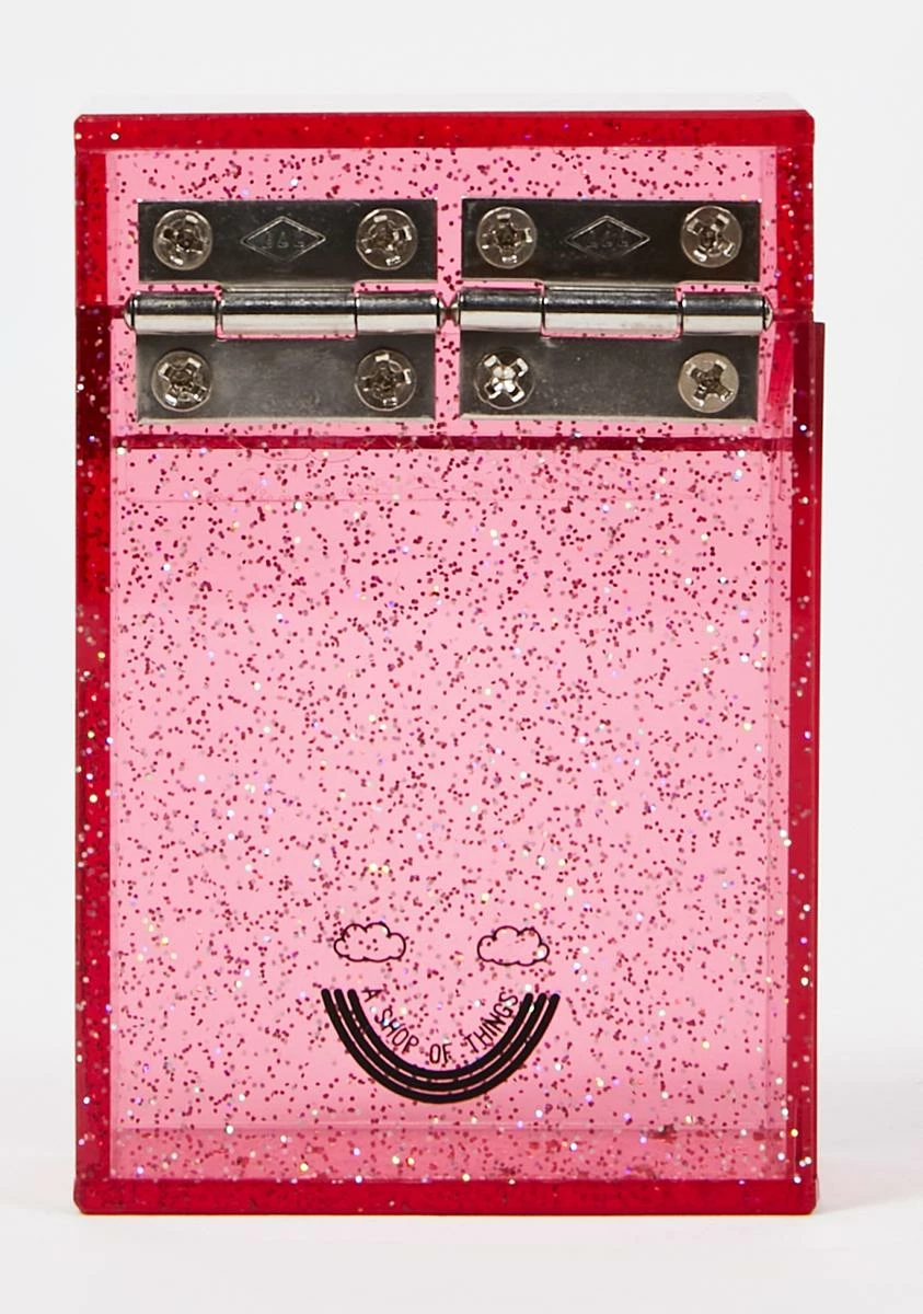 has a glittery acrylic construction, a hinge open lid, and magnetic snap closures, and fits a standard size cigarette bow or whatever else you wanna put inside!