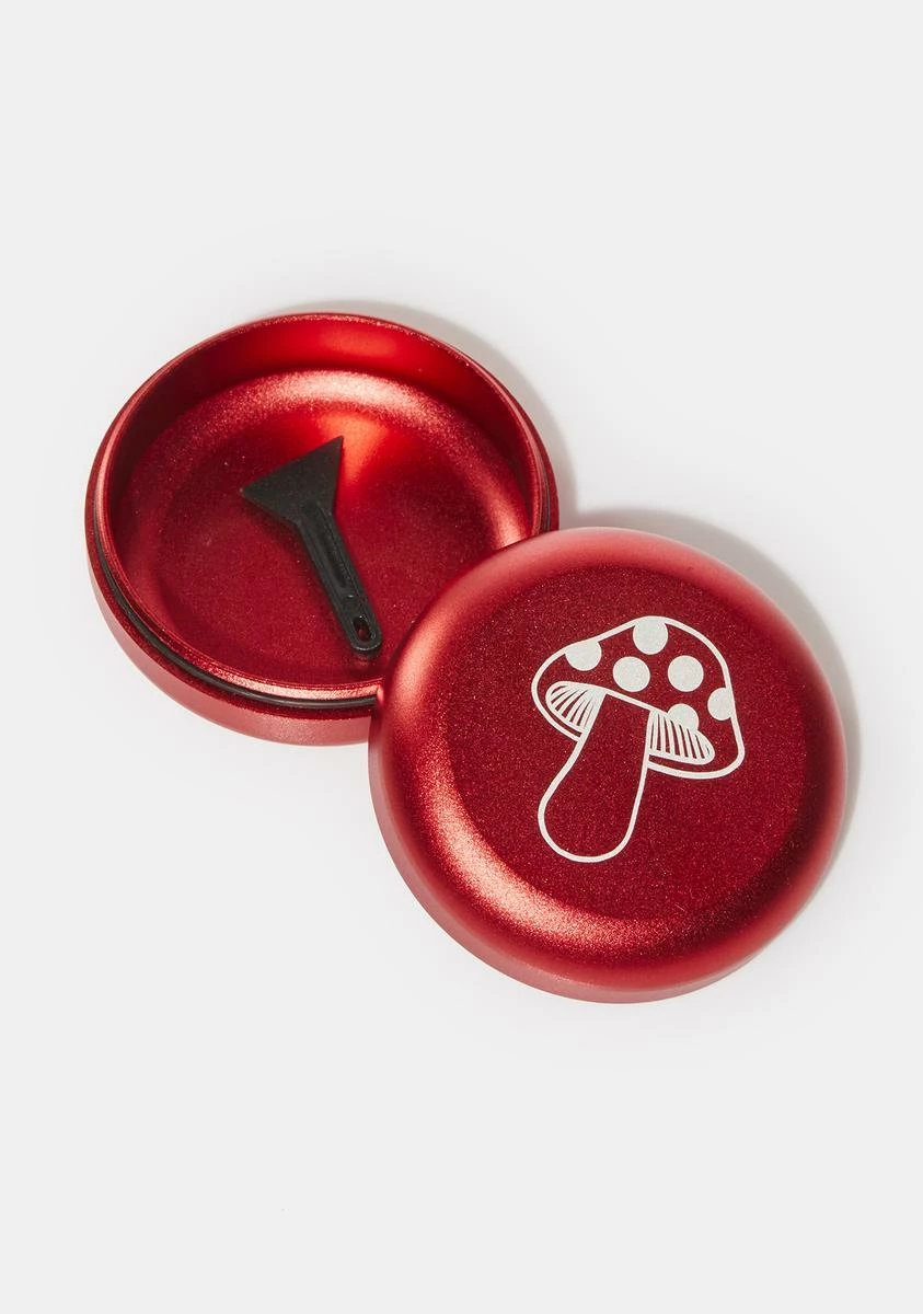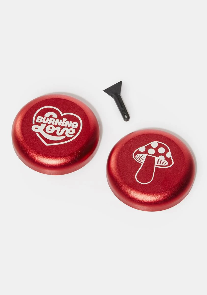 cuz you’ve got a pocketful of sunshine. This jar comes in a round metallic construction, with a mushroom graphic on the front, and a burning love logo graphic on the back.
