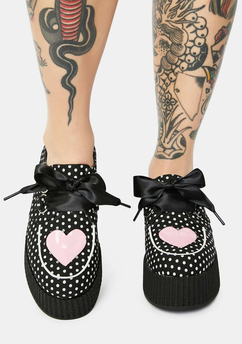 have a vegan leather construction, D-ring hardware with adjustable ribbon lace-ups, a polka dot pattern all over, and cute patent heart details on the front.