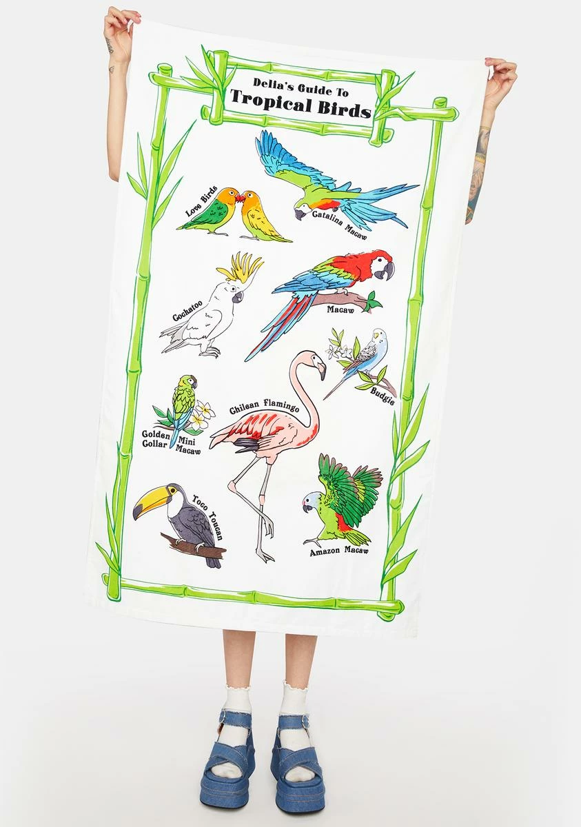 you’ll find the perfect photo op! Take a good look around with this beach towel that has a cotton construction with a graphic guide to tropical birds printed across the front.