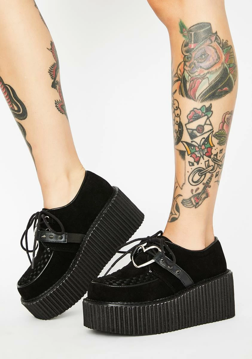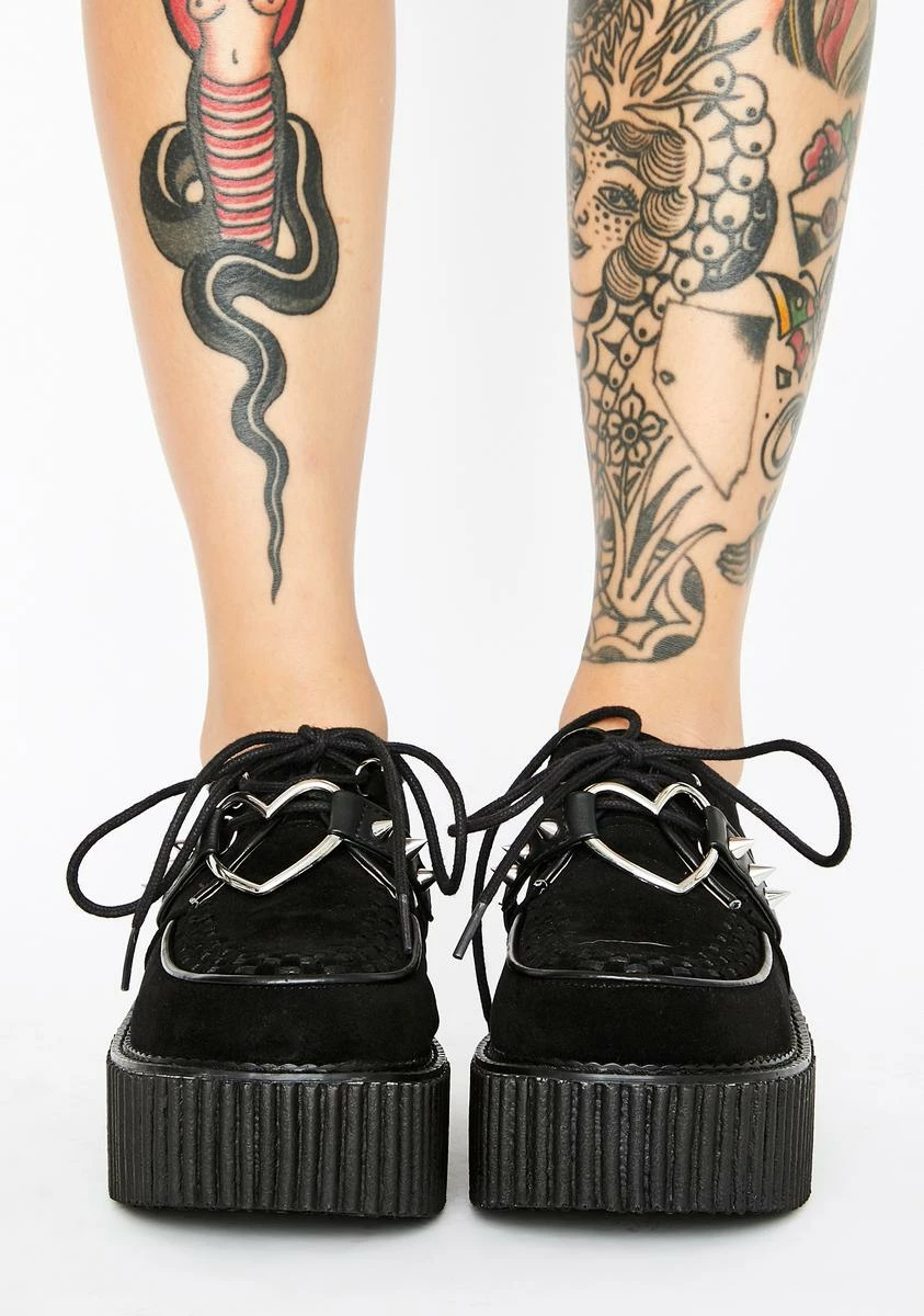 don’t wear yer heart on yer sleeve, or someone will rip it right off. Keep yer luvv strapped up tight with these brutal platform creepers, featuring vegan suede ‘n leather construction, black interlacing details on tha rounded toe, D-ring lace ups, and cone studded straps securing a heart shaped o-ring to tha front.