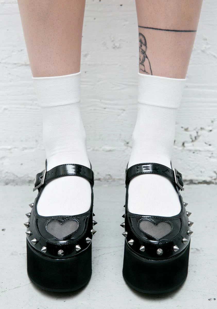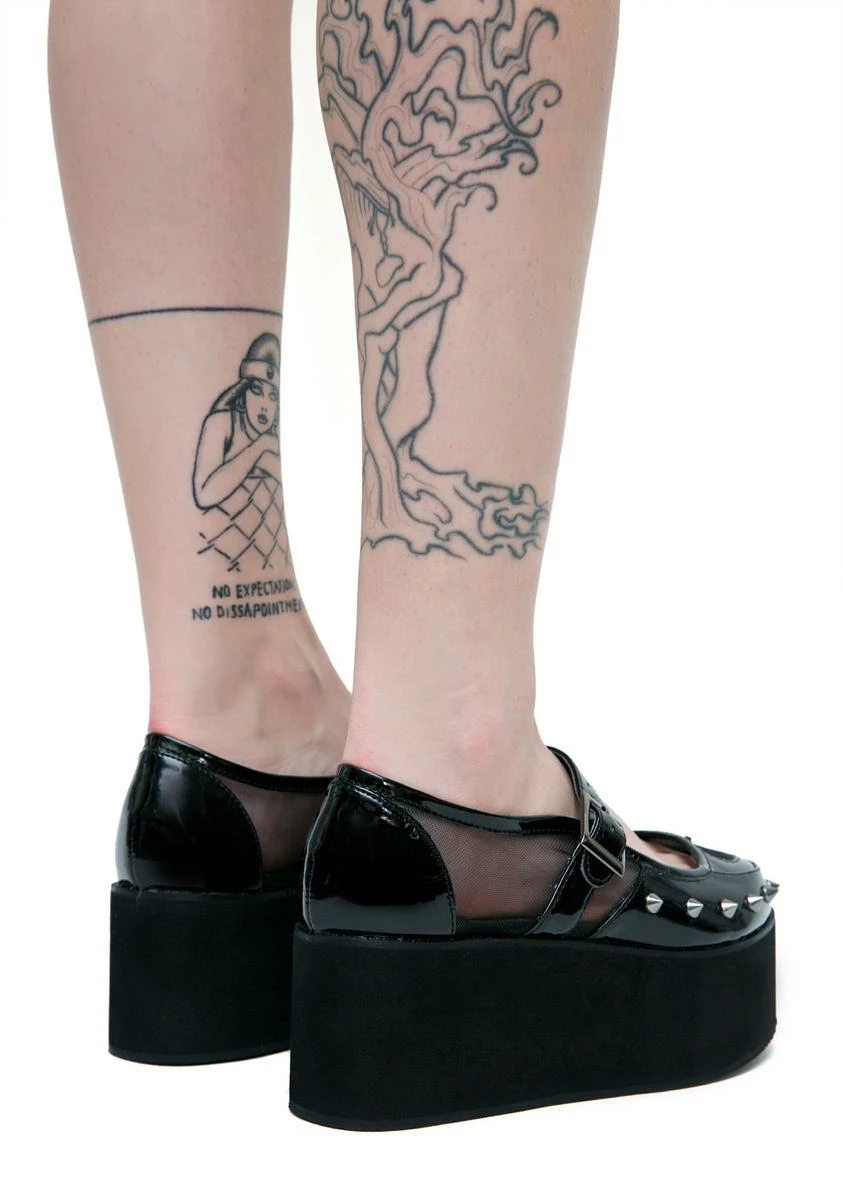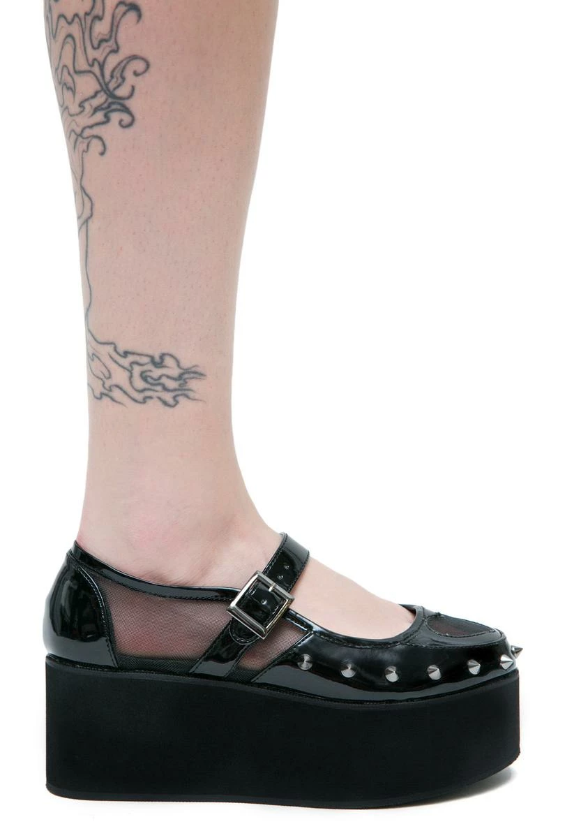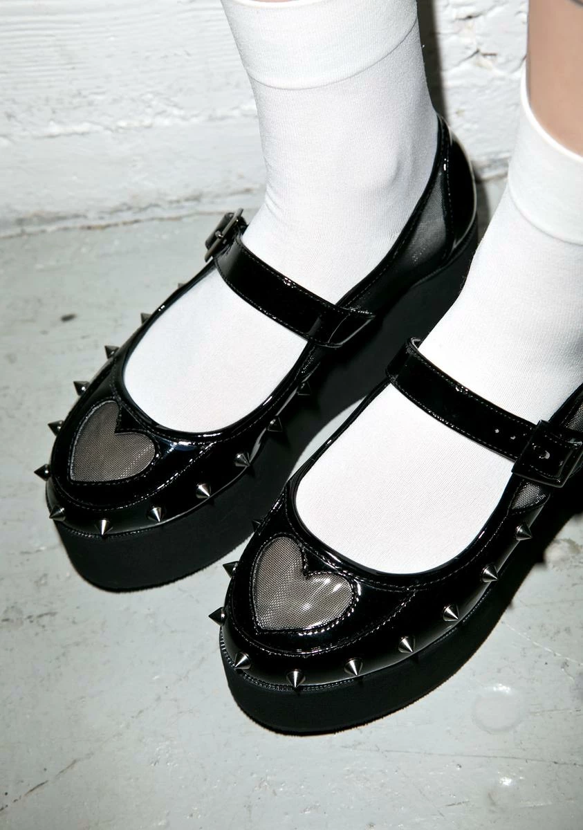 your divine powers can prove destructive as well, kitten. These deadly rounded flatflorms feature a black 100% vegan patent construction, black mesh cutouts along the sides, heart cutout on the toe, adjustable buckle strap, and spiked cone studs dotting the edges of the toe to let âem know they better tread lightly.