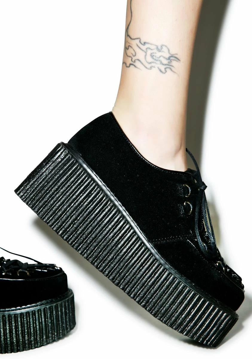 …Cuz yer star’s on the rise, BB. Featurin’ pyramid studs ‘n’ laces arranged in a pentagram, these vegan suede creepers are everyday magick.