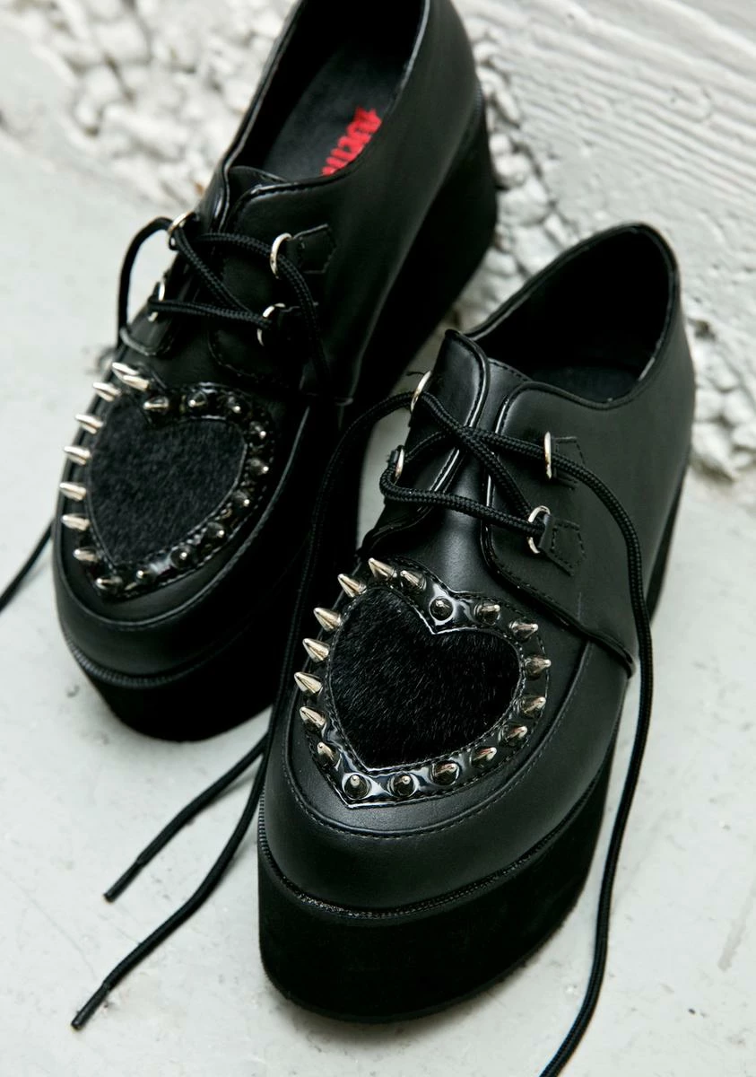 but take solace in the fact that you we’re the best we ever had…Tell ‘em that ya ride solo from now on in these wicked round toe creepers, featuring black 100% vegan leather construction, patent piping details, D-ring lace ups, padded insole, and a furry black heart cutout on the toe surrounded by deadly spiked cone studs.