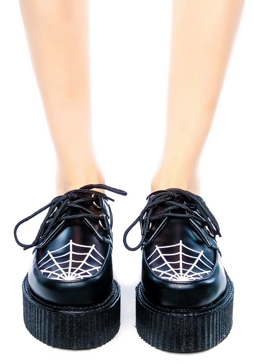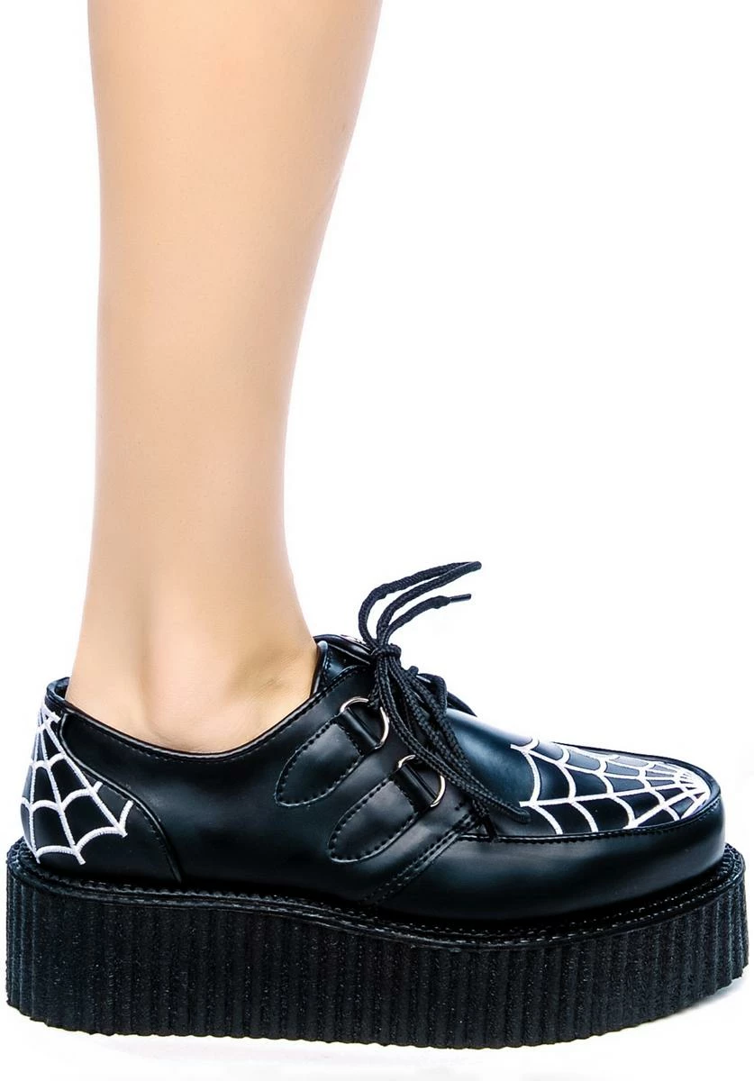 Demonia Spider Web Embroidered Creepers are two inched, all black, leather upper creepers with a white sweet spider web stitched on the front and back of these creepy creepers. Two hookz on each side for your laces, so get tangled up in these bad boyz.
