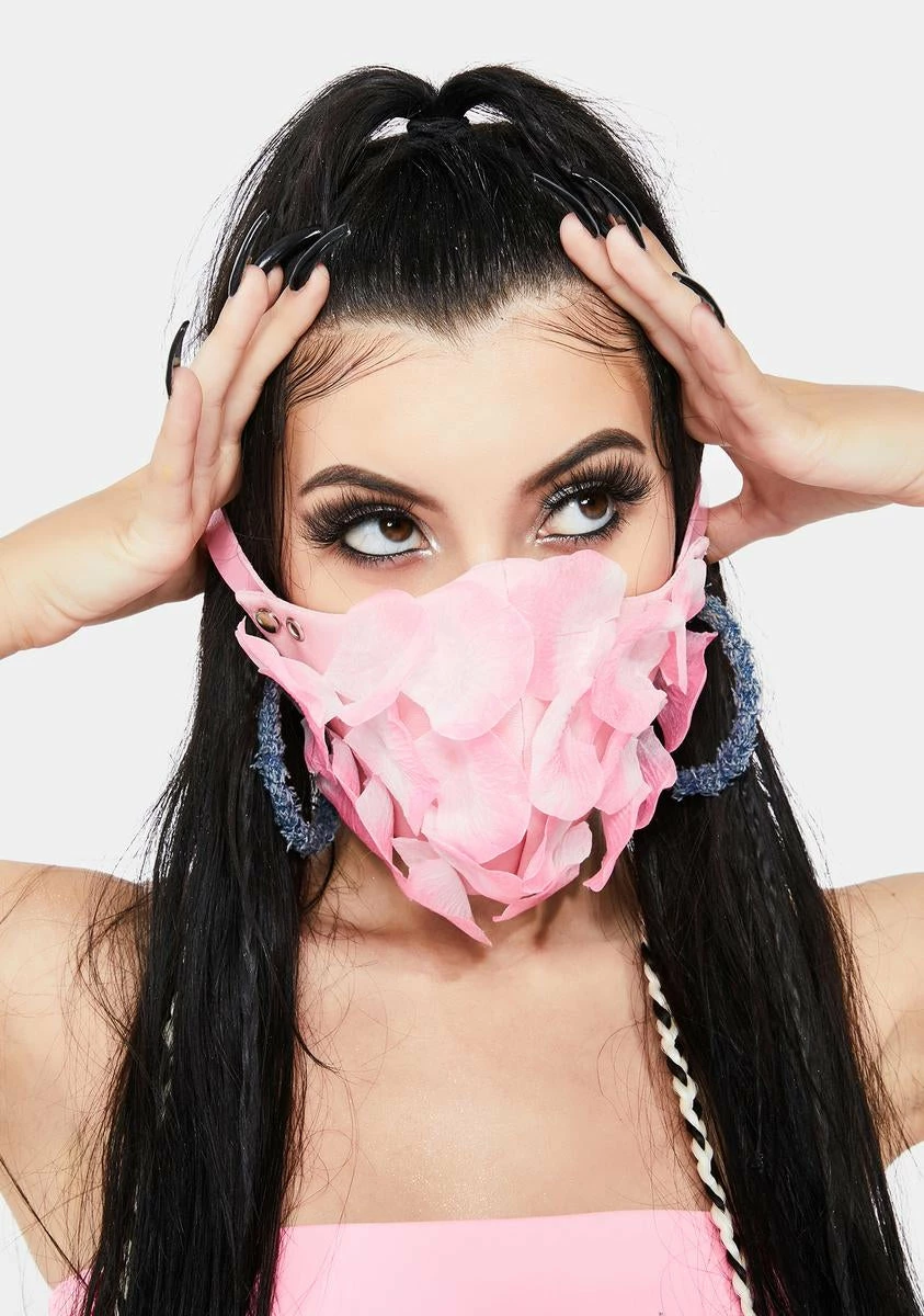 even fairies need protection. This sweet face mask has a faux leather construction with faux flower petals decorating the outside and snap buttons that attach to the ear loops.