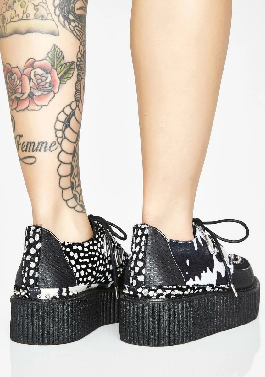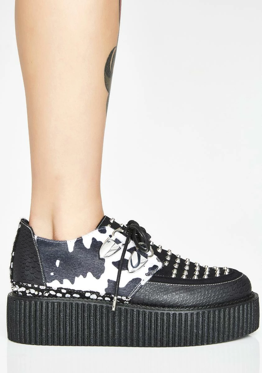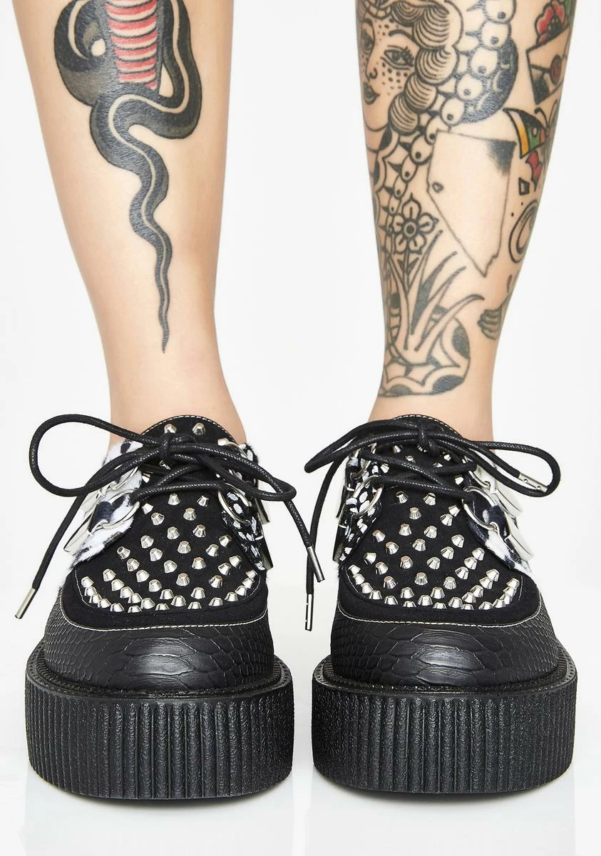 cuz ya keep it creepy babe. Stomp around in these sikk creepers that have mixed vegan leather deetz all ova, flathead studs on the tops, supa thicc soles Nรขยย lace up closures.