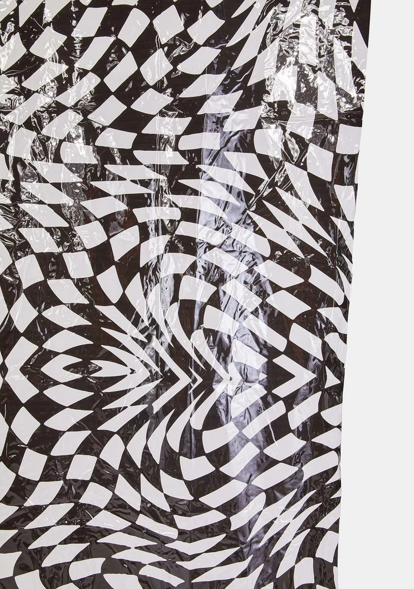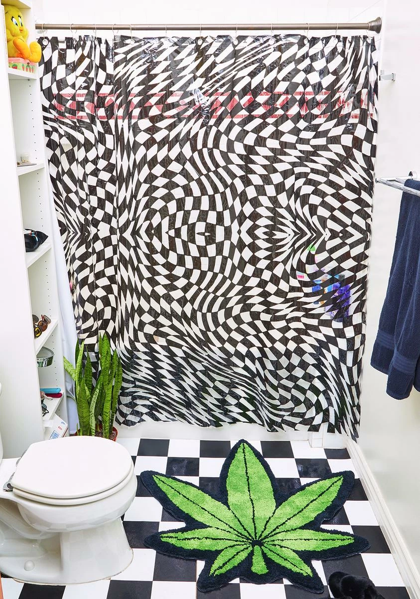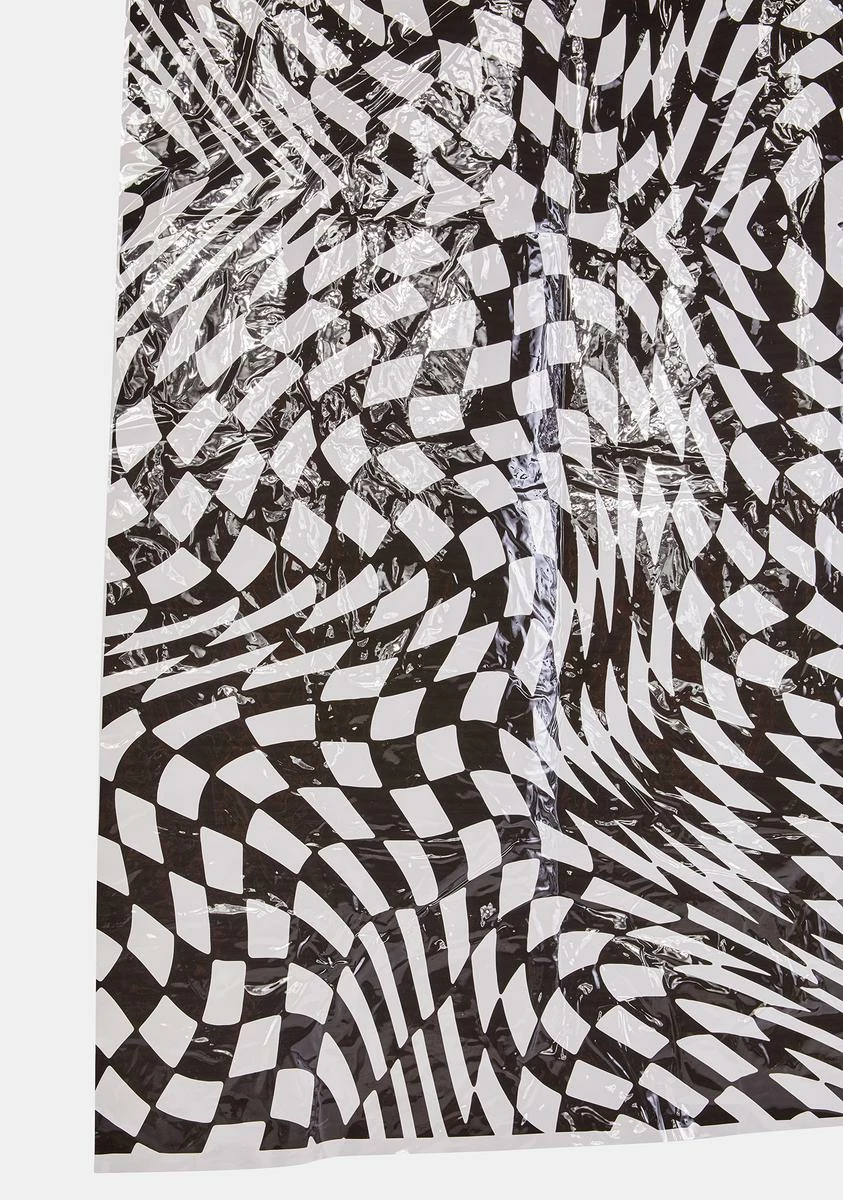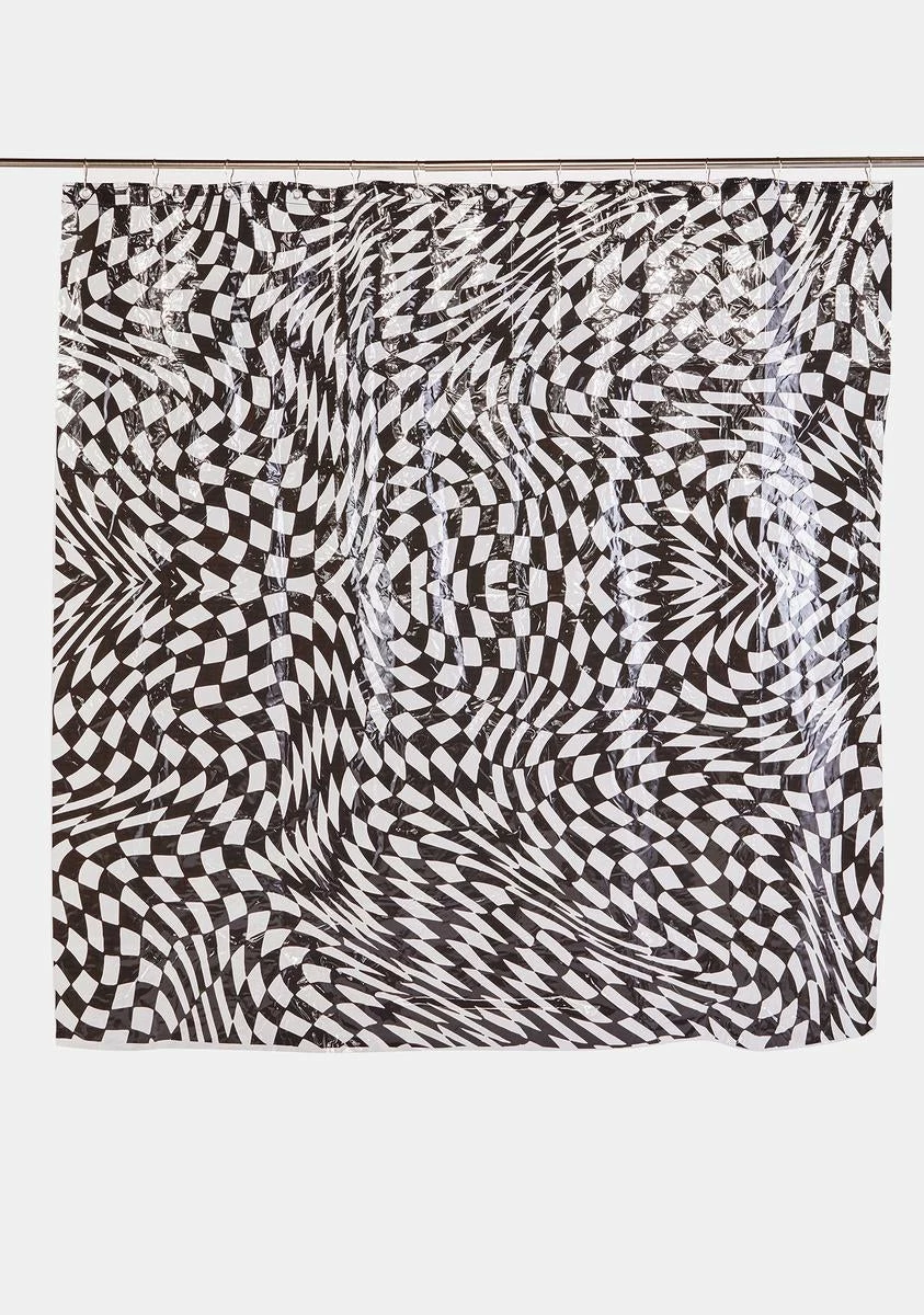 cuz ur a multi dimensional doll. This shower curtain has a warped checkered print design, large grommets, and comes with metal hooks.