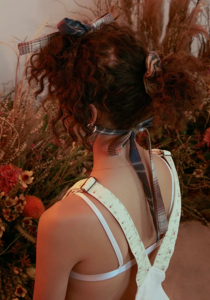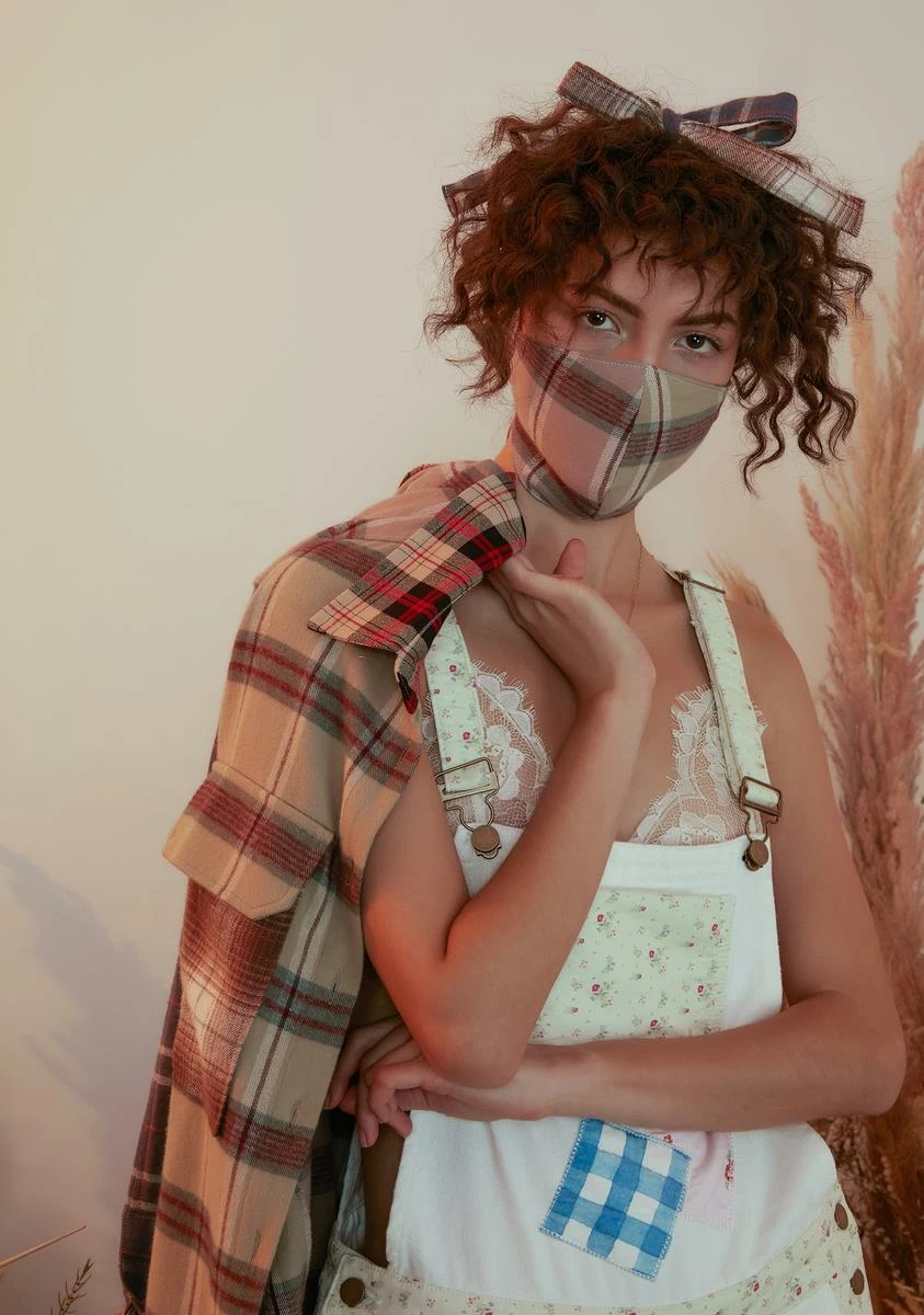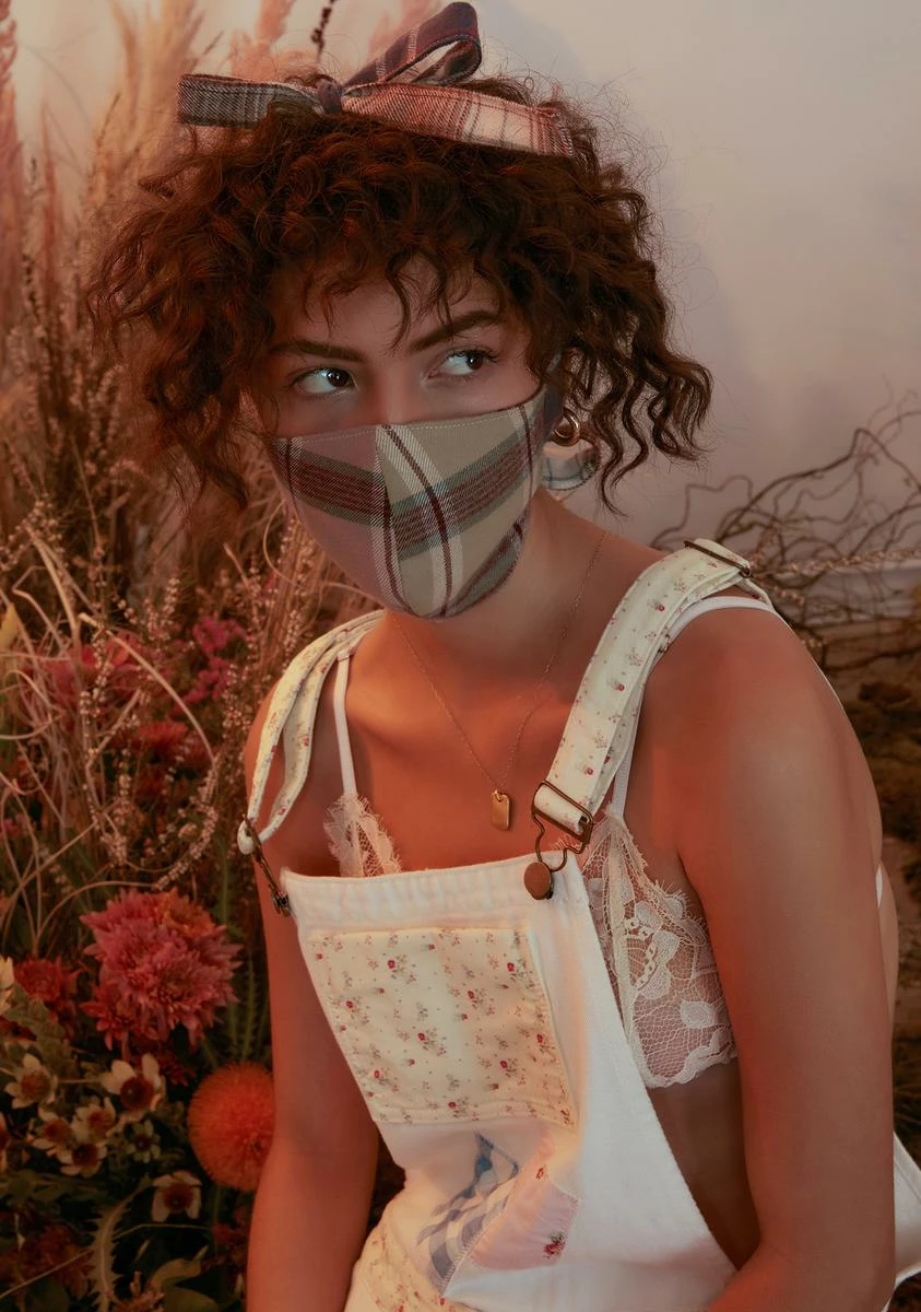 includes a plaid face mask with tie closures and a matching scrunchie!