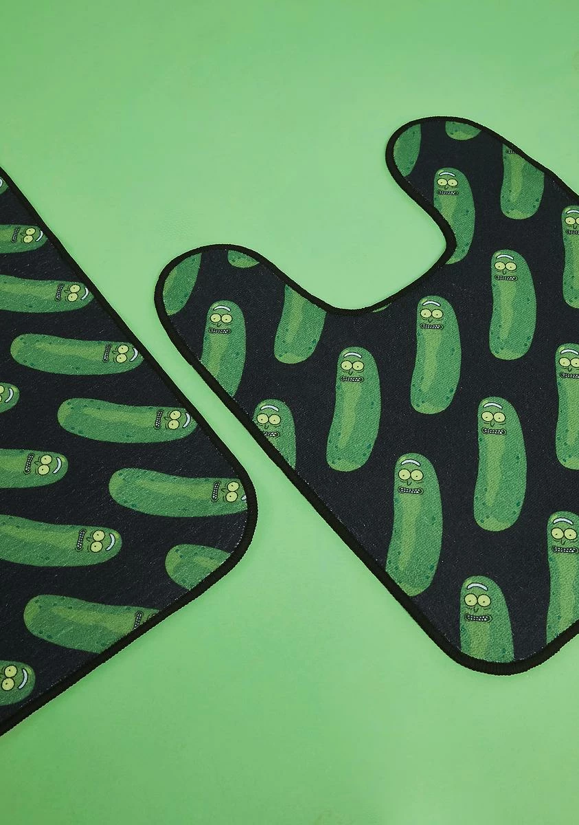 can’t you turn yourself back into human form? This toilet mat and bath mat set has anxious Pickle Ricks printed all over.
