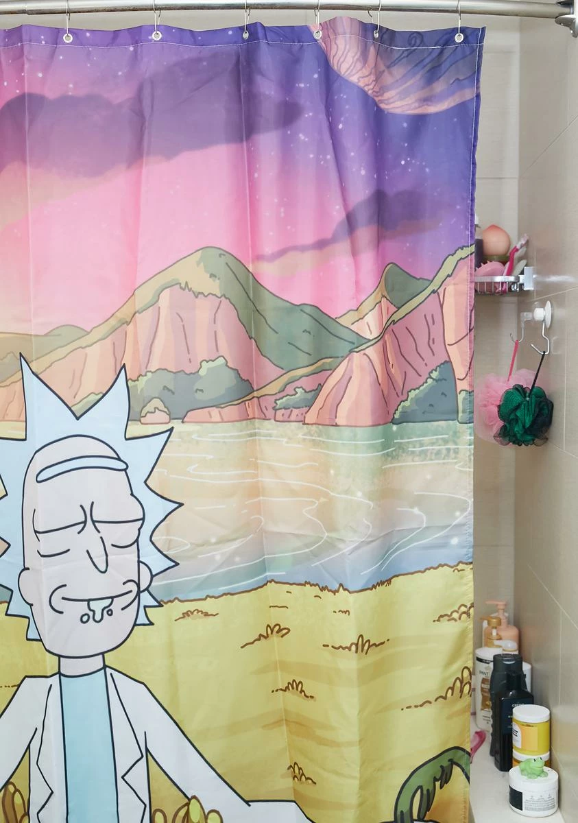 cuz sometimes you need to take a break in some random planet field. Be calm with this shower curtain that has a graphic of Rick in the fields and large grommets.