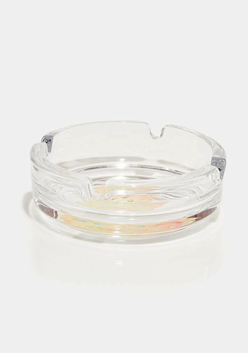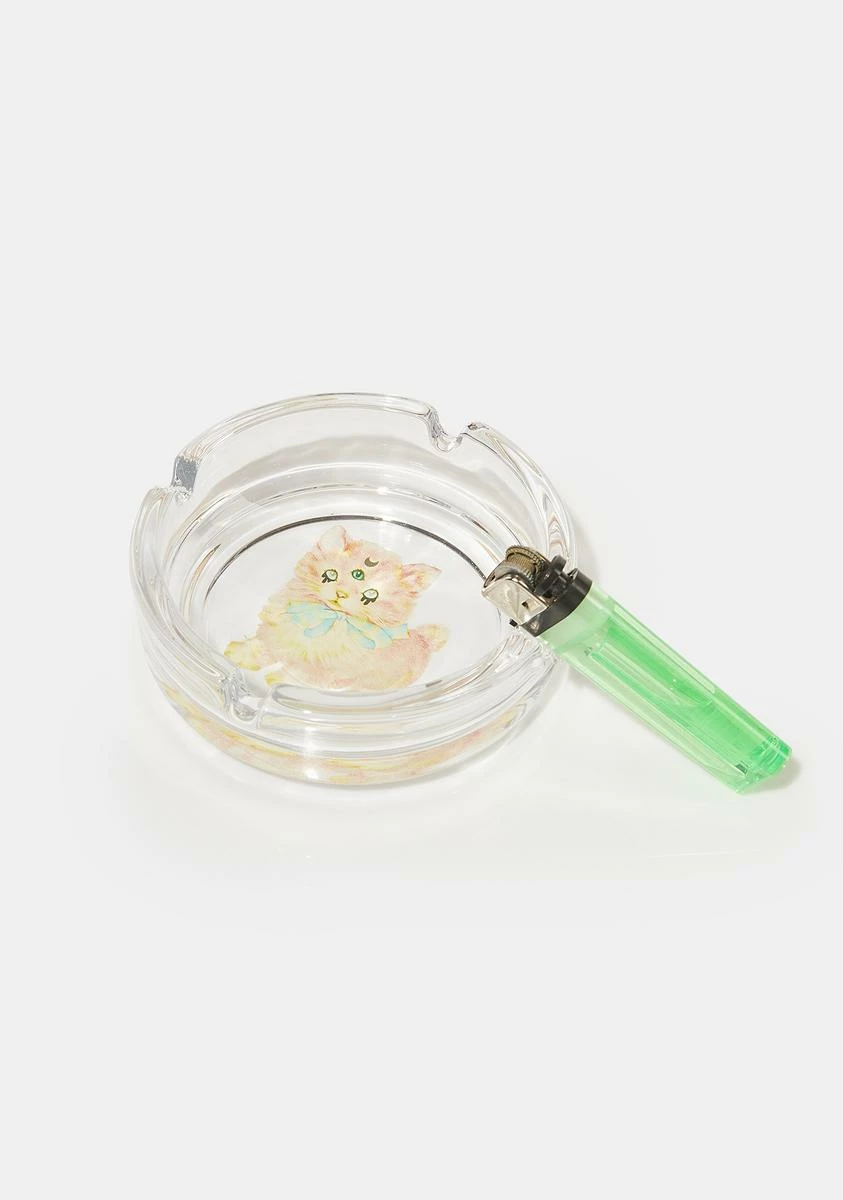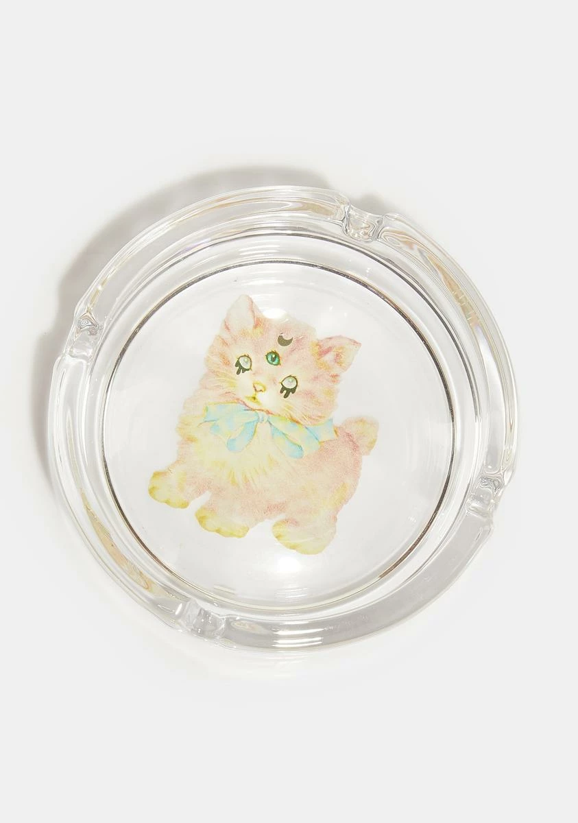 cuz I wanna make you purr. This ashtray has a clear lucite construction, notches along the edge, and a goth kitty graphic in the center.