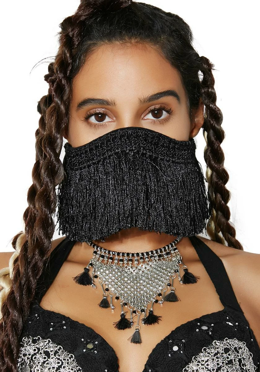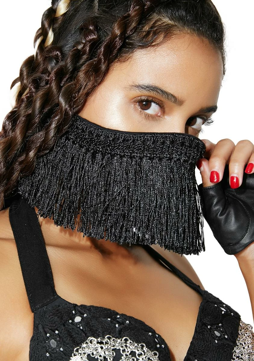 ur oh so mysterious, babe…this sikk mask has a fitted soft filter, fringe detail, elastic band and adjustable snap closure.