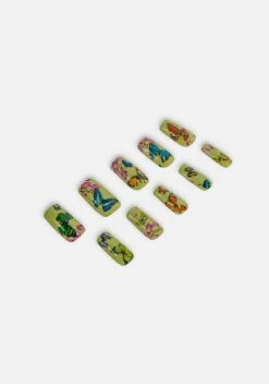 soar to new heights! This handcrafted press on nail set has beautiful collage-style butterfly graphics.