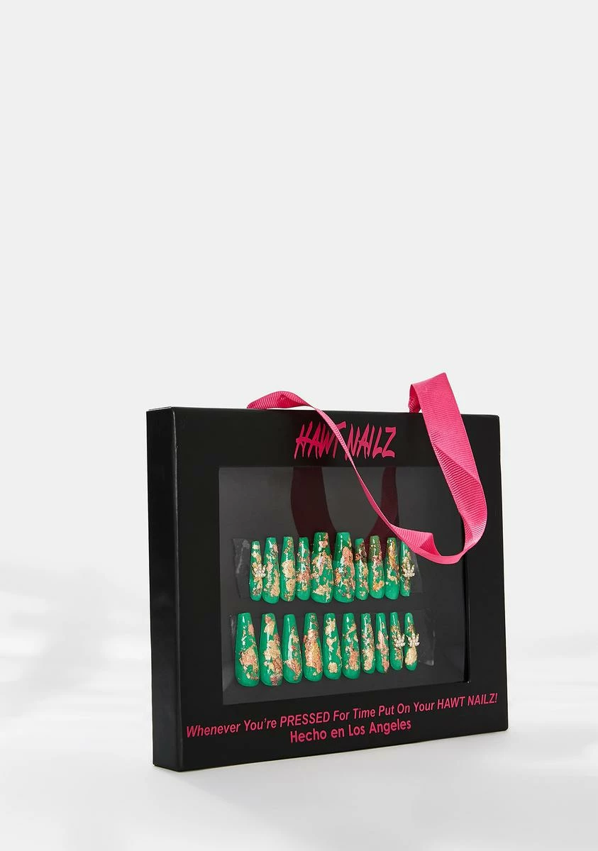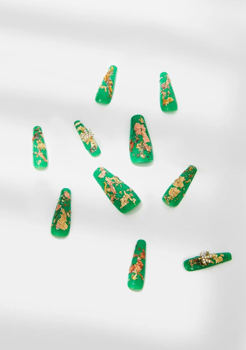 because you’re the queen of green. This press on nail kit is entirely handmade and includes neon green nails encrusted with faux gold leaf.