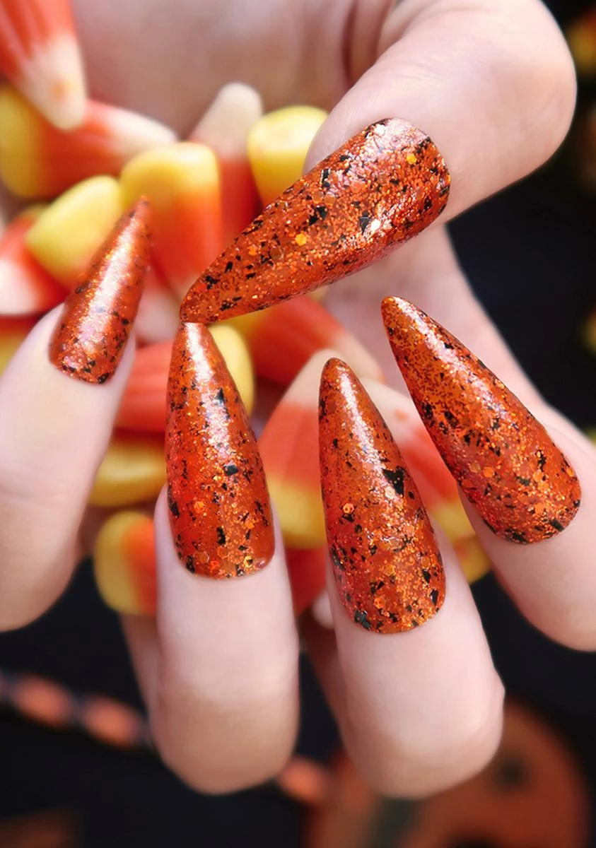 cuz youâre down for the haunt. This orange and black glitter nail polish has an orange tinted base with a quick drying and chip resistant finish.