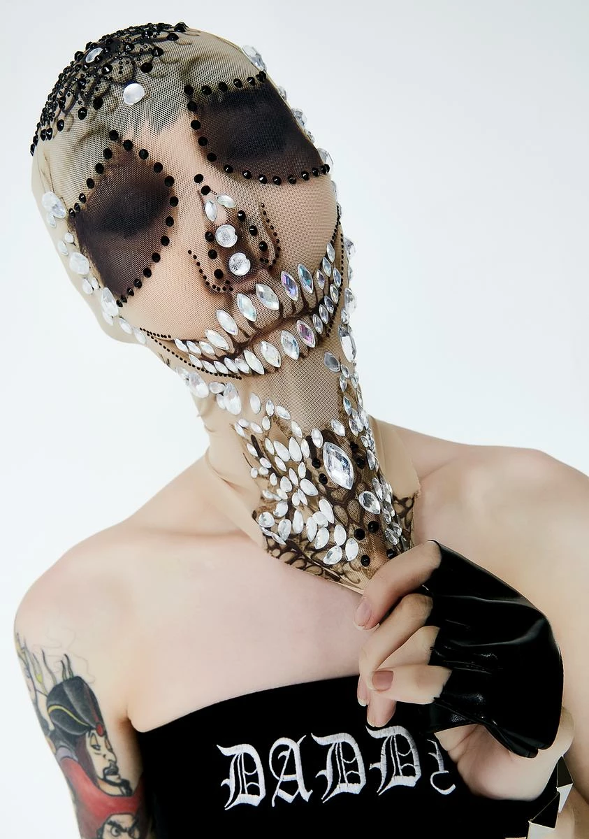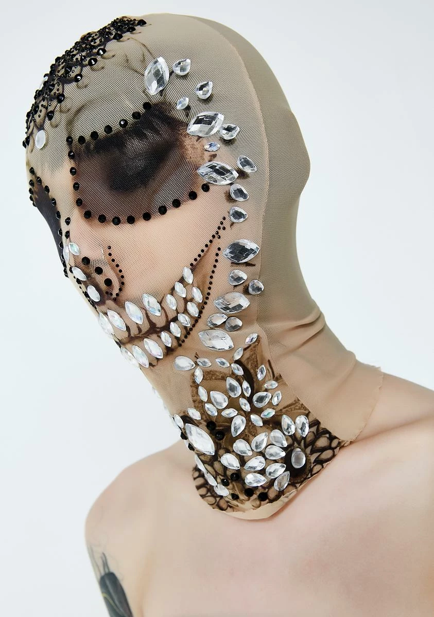 is sure to make ‘em scream. This sheer nude mask has lots of rhinestones all over and sheer black panels at the eyes.