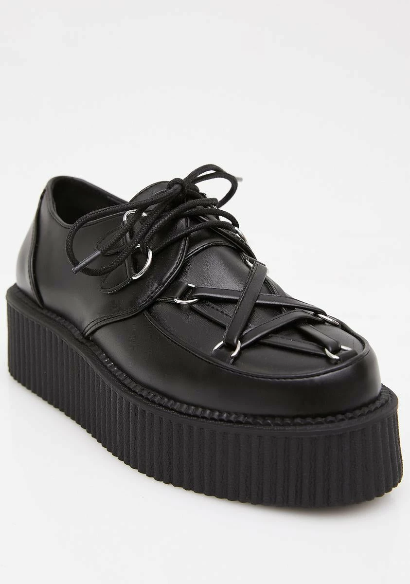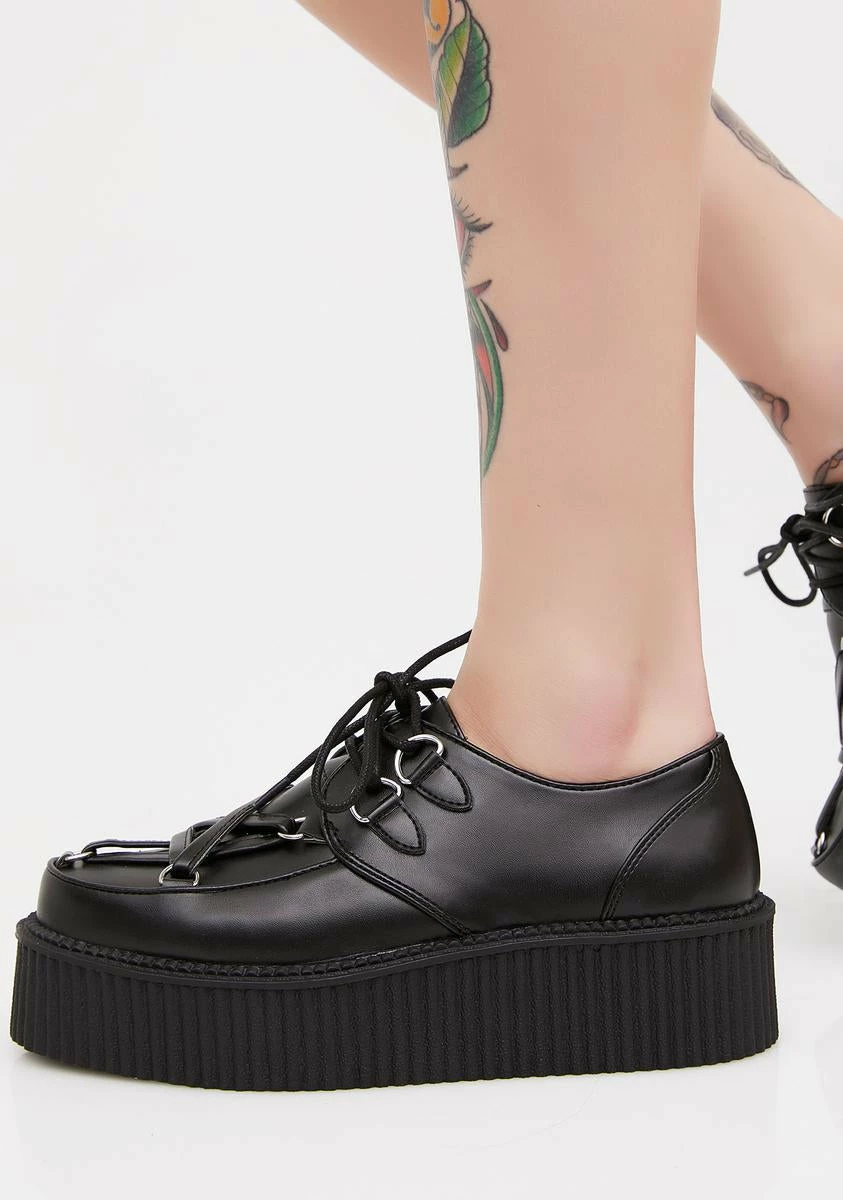 cuz youΓ’ΒΒre puttinΓ’ΒΒ a curse on Γ’ΒΒem. These black vegan leather creepers have thikk soles, a pentagram design on top, and lace-up closures.