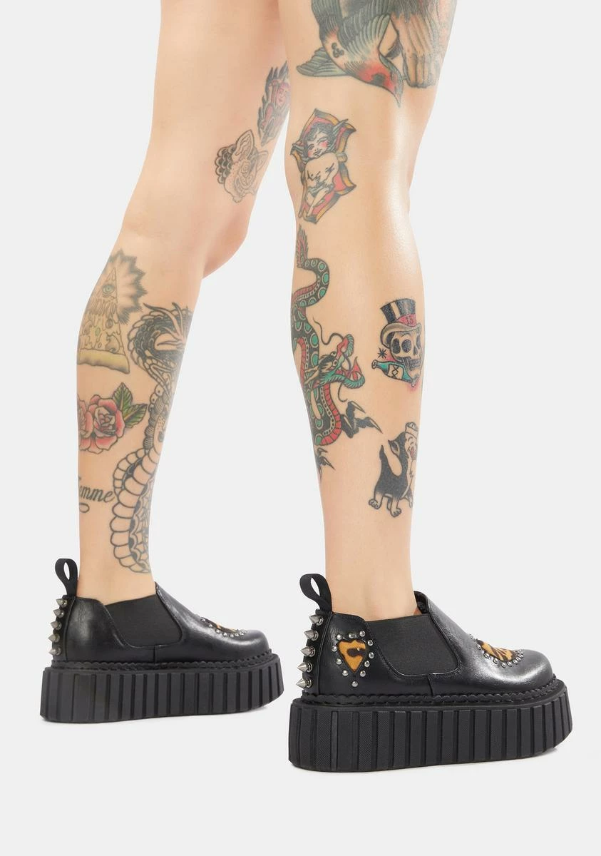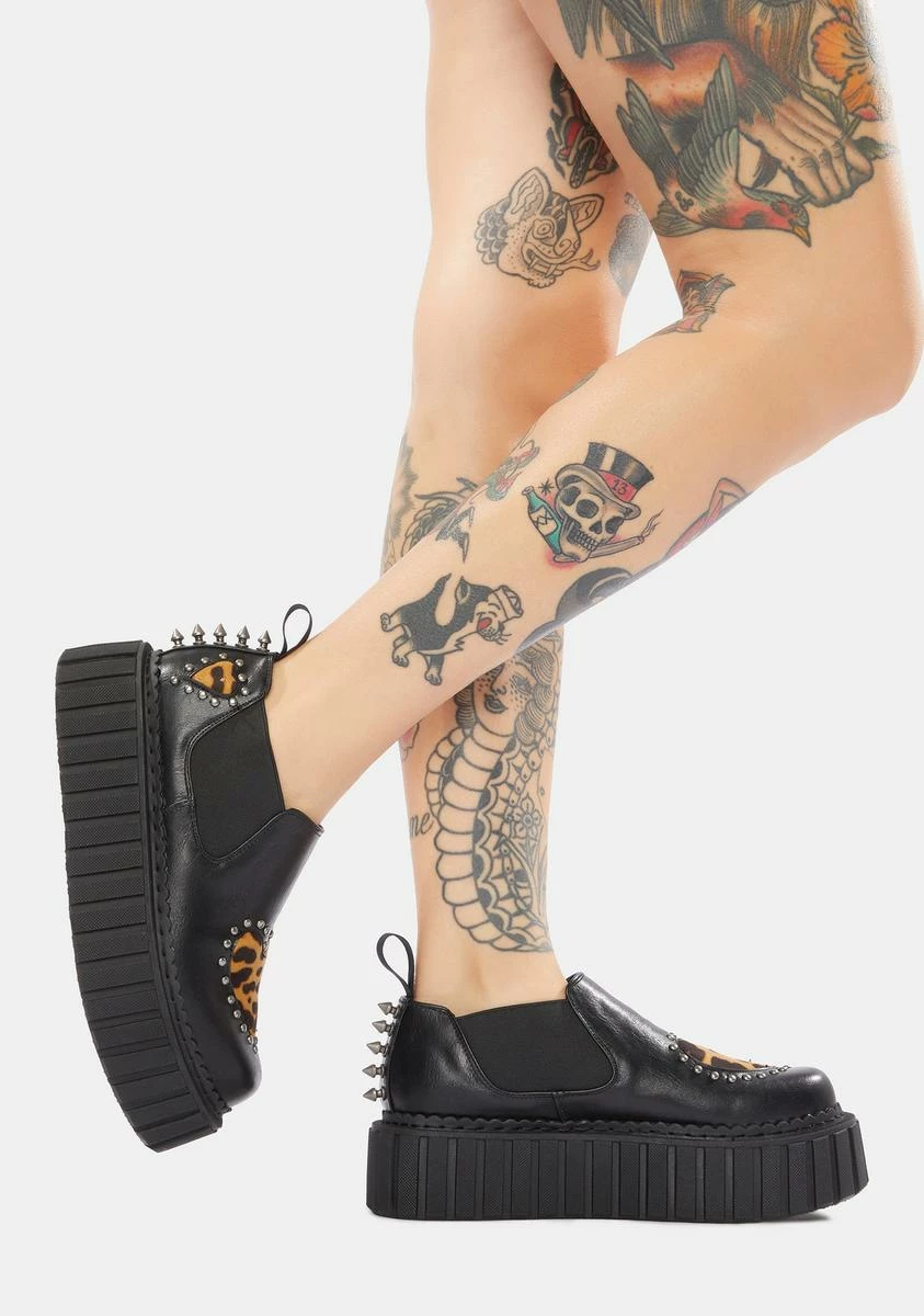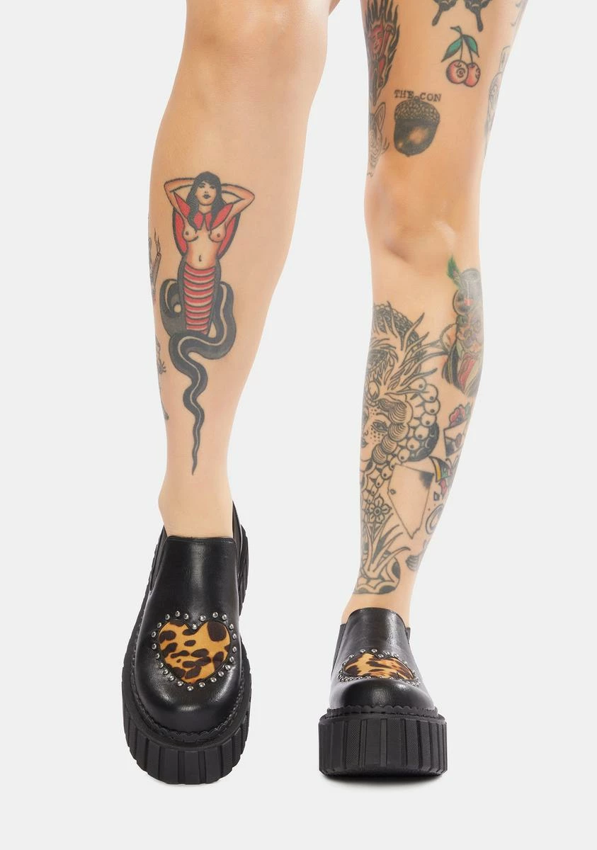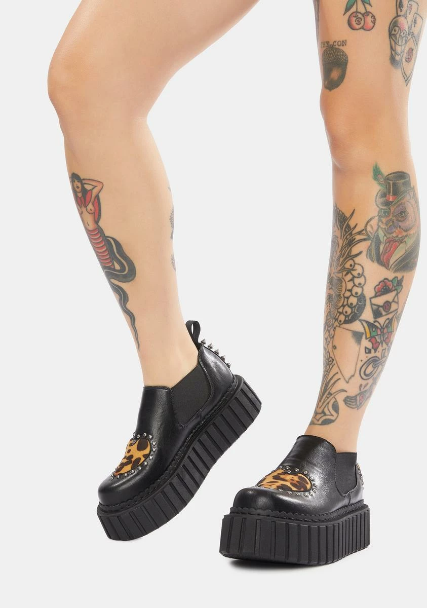 go wild for awhile! These vegan leather slip on shoes have chunky creeper soles, leopard print hearts, stud & spike detailing, and elastic gussets on the sides.