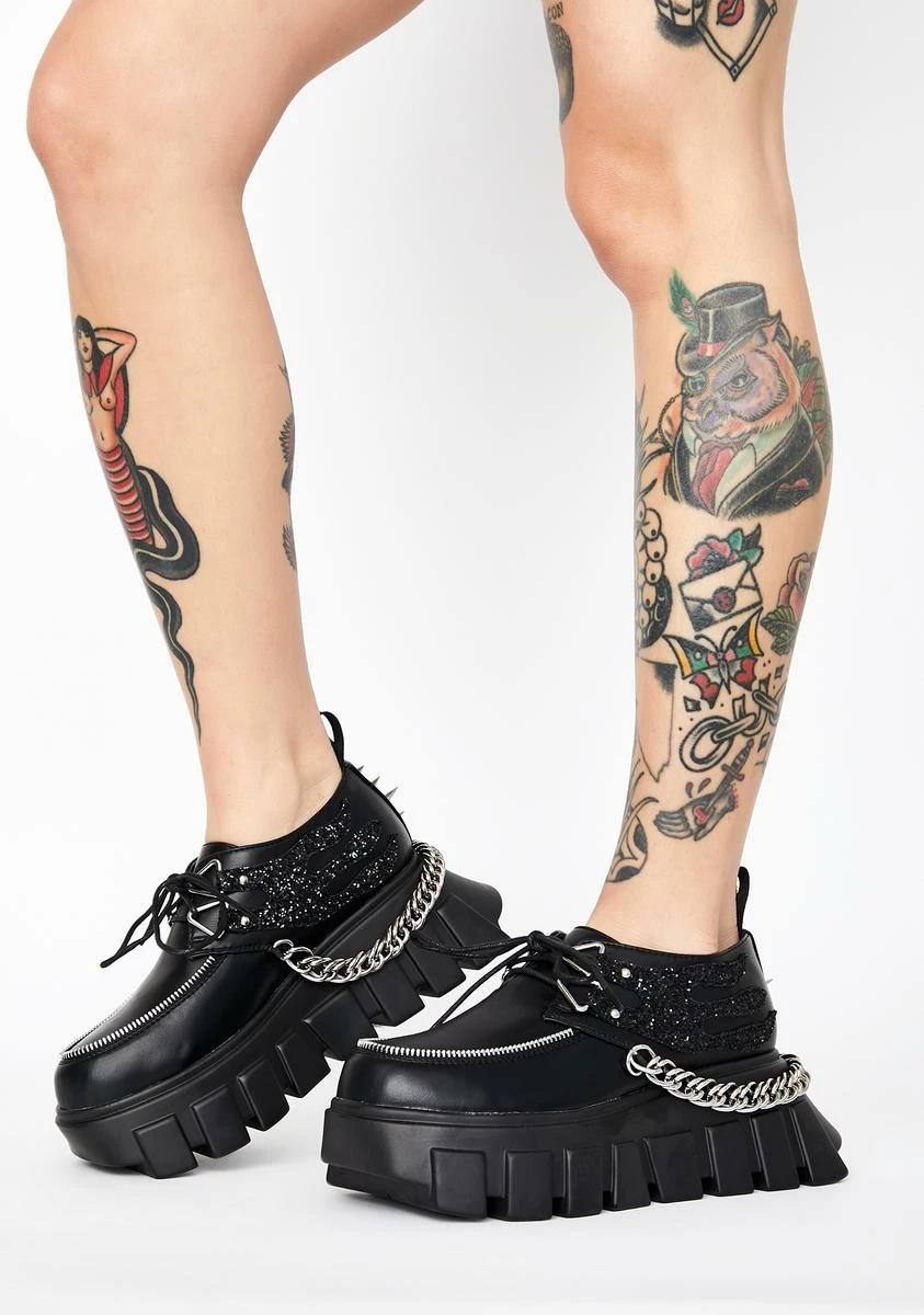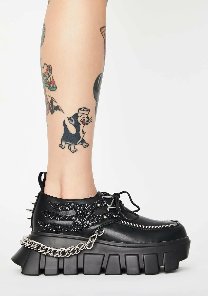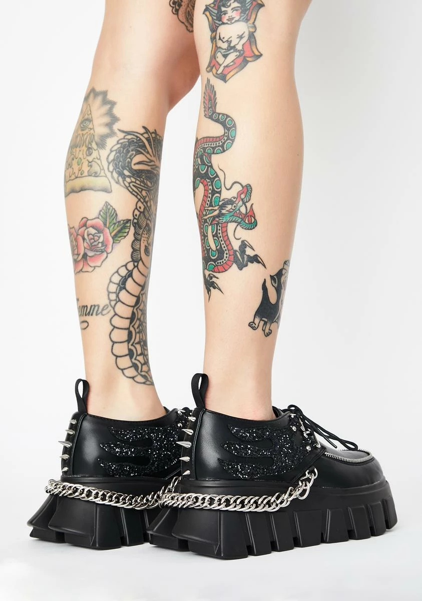 gotcha lookinâ dope AF. These platform creepers have rounded toes, shimmerinâ glitter, spike Nâ chain hardware, and treaded soles.