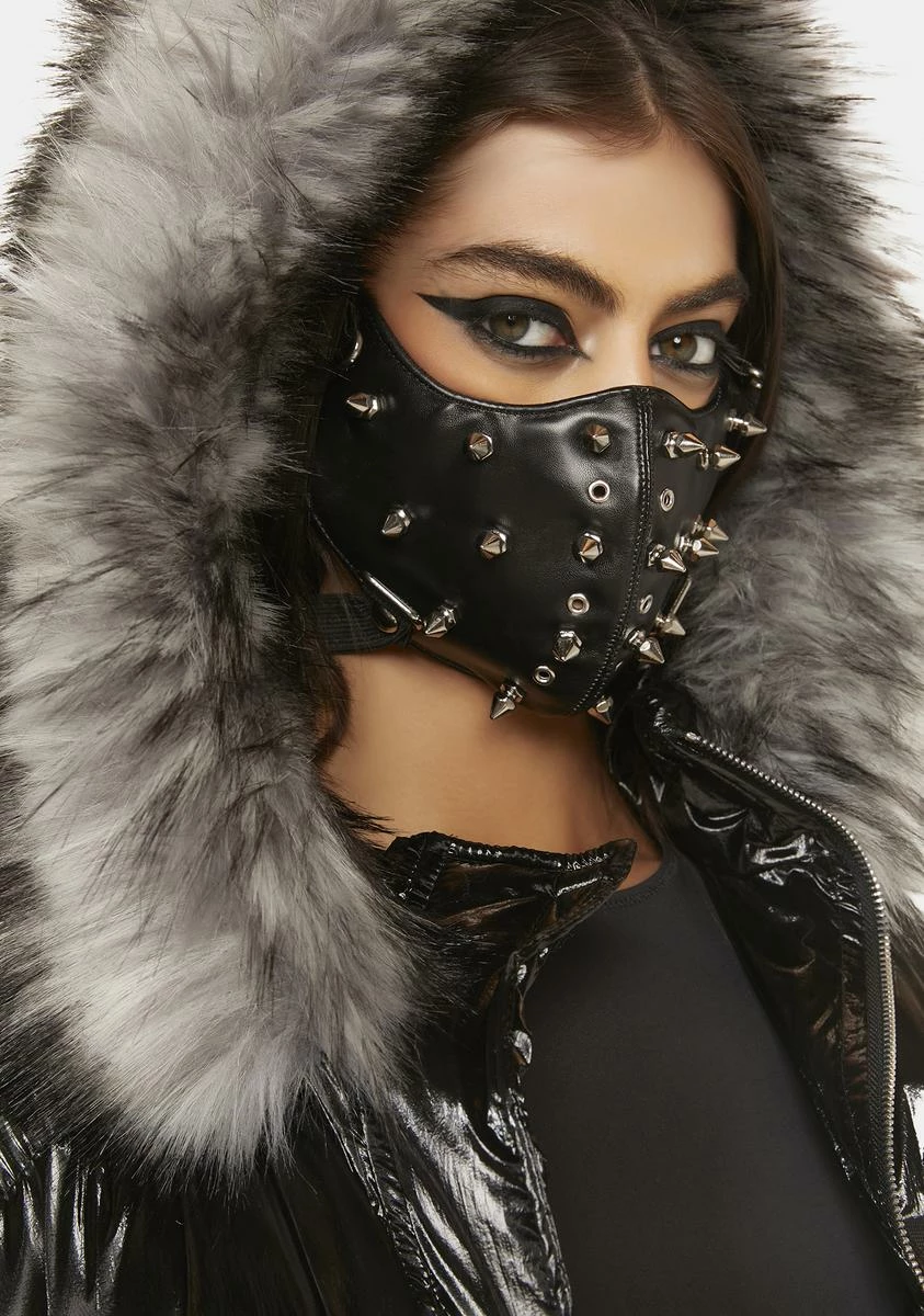 cuz you’re riding close to danger, babe. This vegan leather face mask has spike studded hardware and elastic straps for a secure fit.