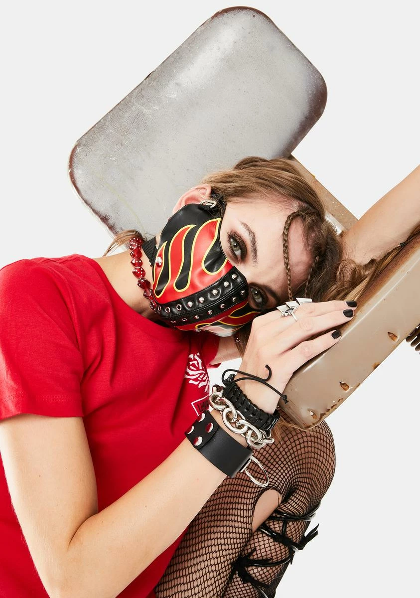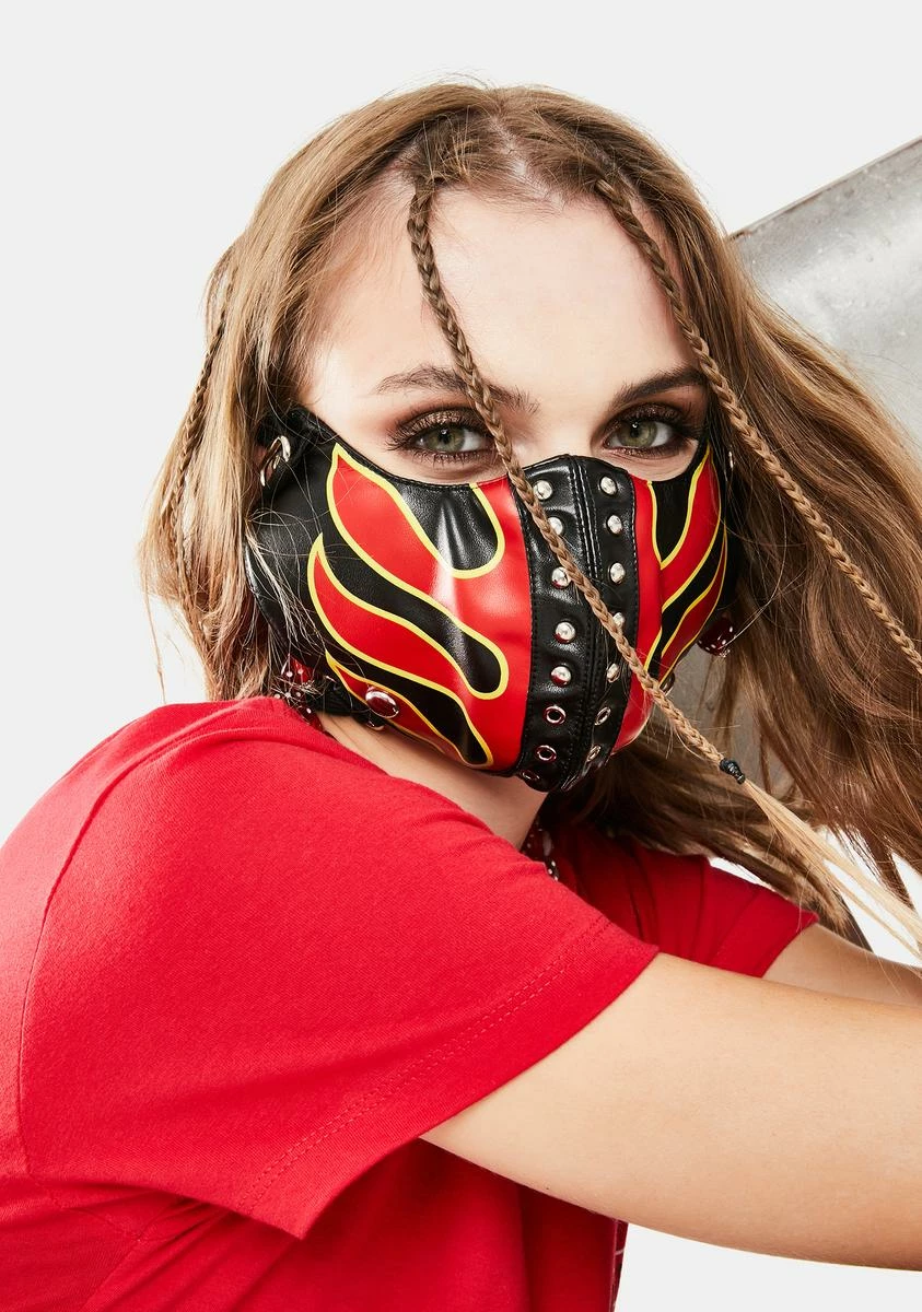 this vegan leather face mask has an all over flame design, studded nose piece, and elastic straps for an easy fit.
