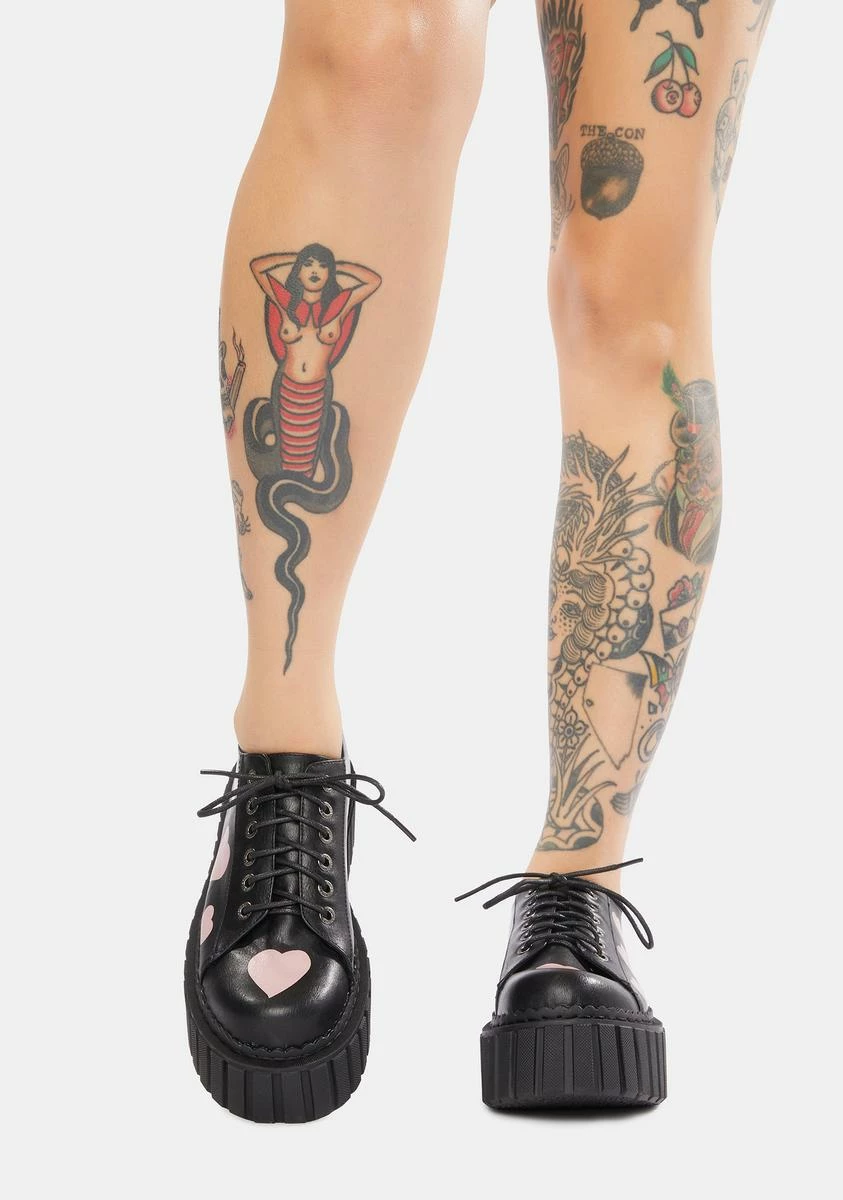 you’ve got a royal flush. These faux leather creepers have a pink heart print, metal spike details on the heel, front lace up closures, and chunky platform soles.