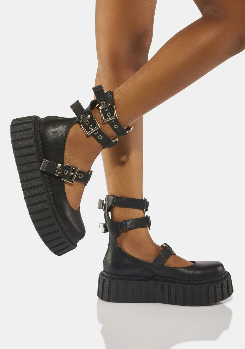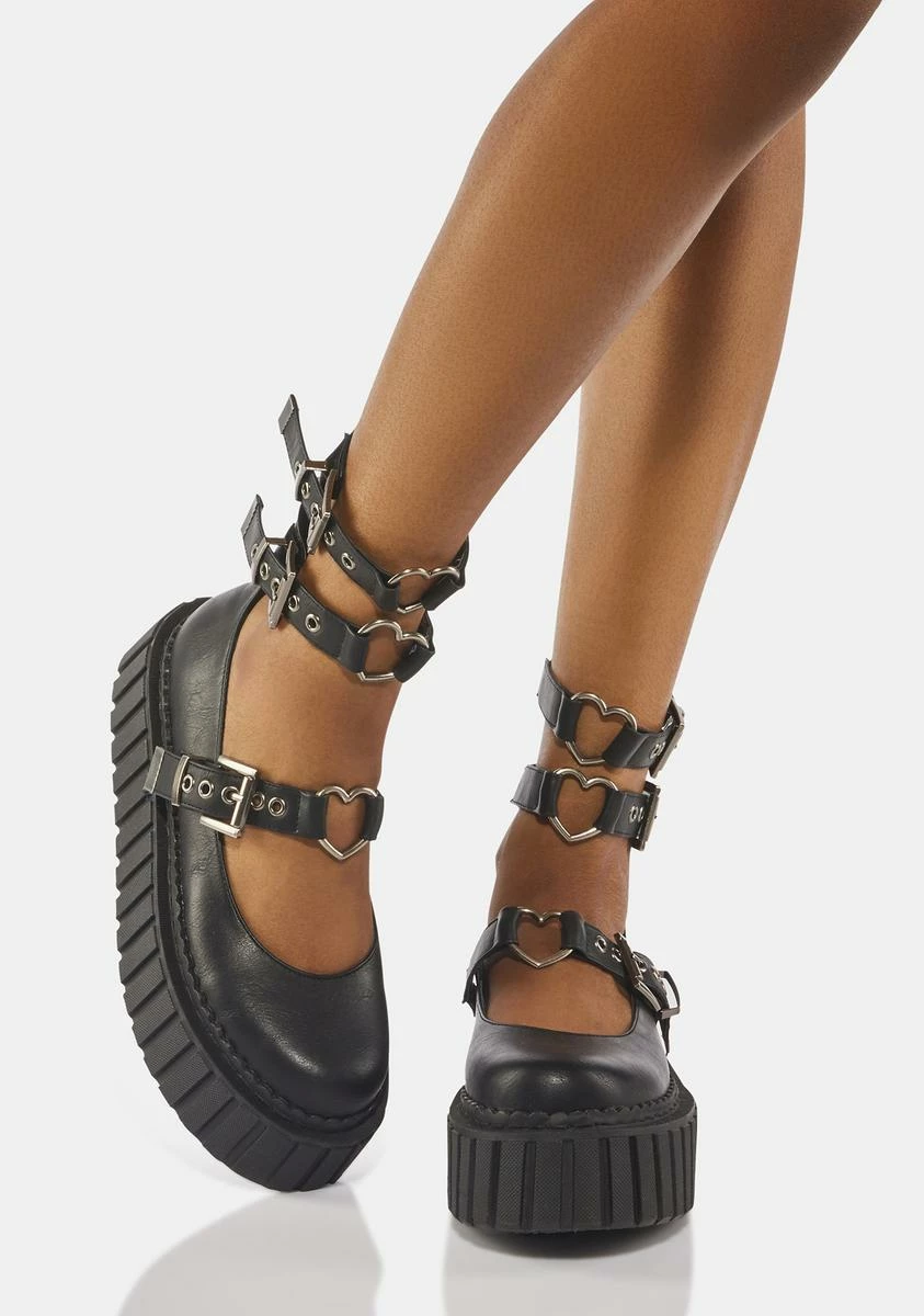 have a vegan leather construction, molded creeper platform soles, adjustable buckle strap closures, and heart ring hardware.