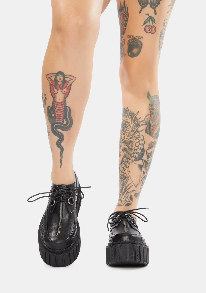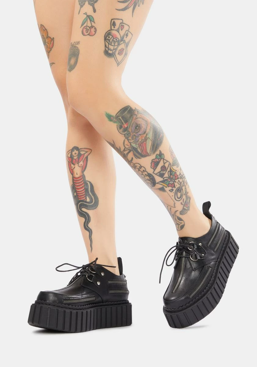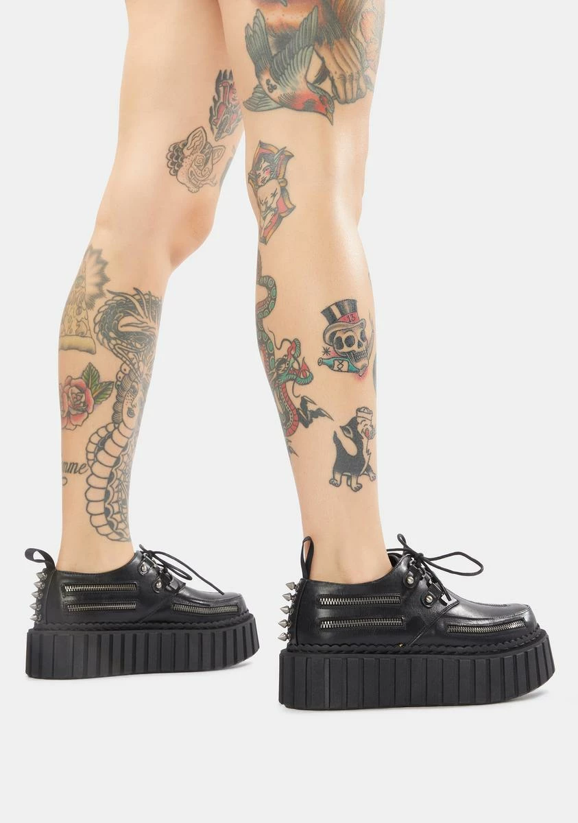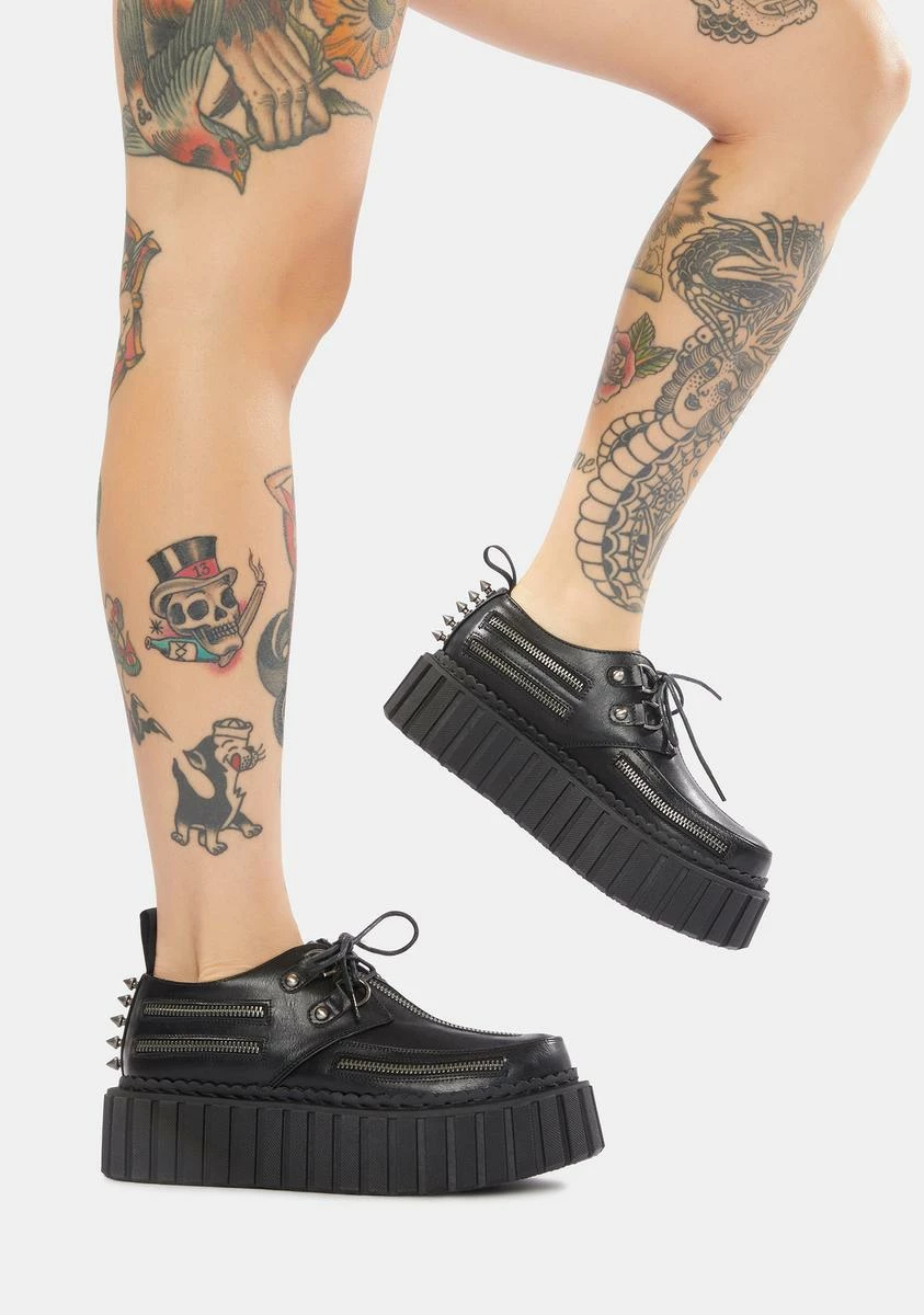 you gotta do what you gotta do. These vegan leather creepers have zipper details along the sides of the upper, silver spike studs on the heel, and front lace up closures with D-ring hardware.