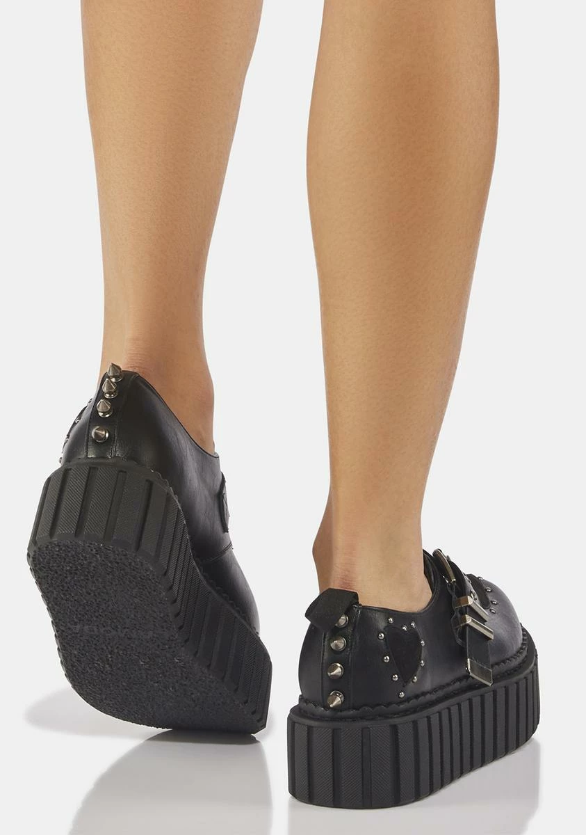 cuz you love romance. Style it up with these creeper shoes that have a vegan leather construction, suede hearts on the upper and sides, pull tabs, spiked studs on the back, and a buckle closure.