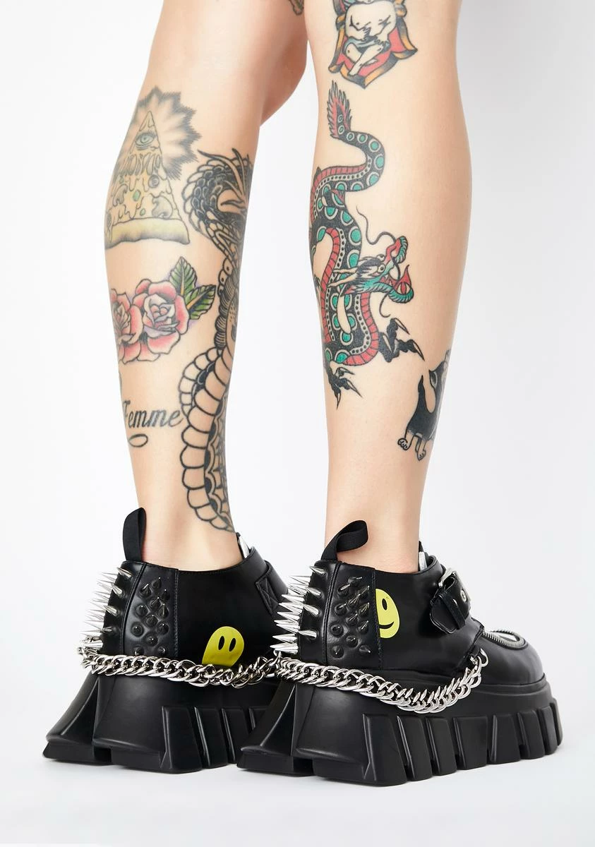 hit âem where it hurts, bae. Look dope AF in these platform creepers that have checkered toes, smiley graphics Nâ chain and spike hardware.