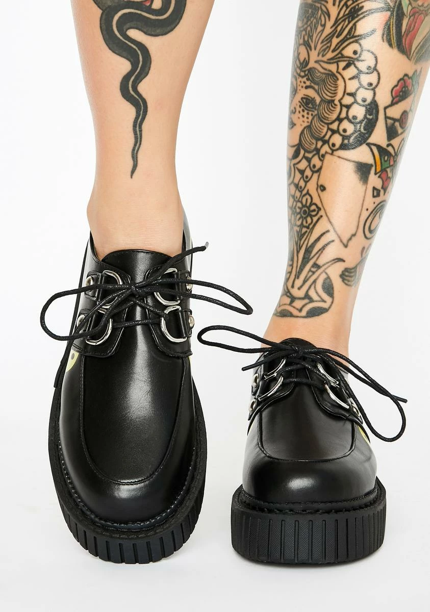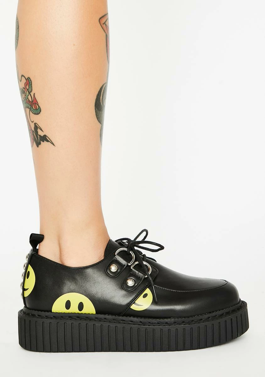 tell Γ’ΒΒem to catch yer good side, babe. Look dope AF in these classic creepers that have sikk smiley graphics all ova, front lace up closures, studded hardware along the back, NΓ’ΒΒ stacked soles.