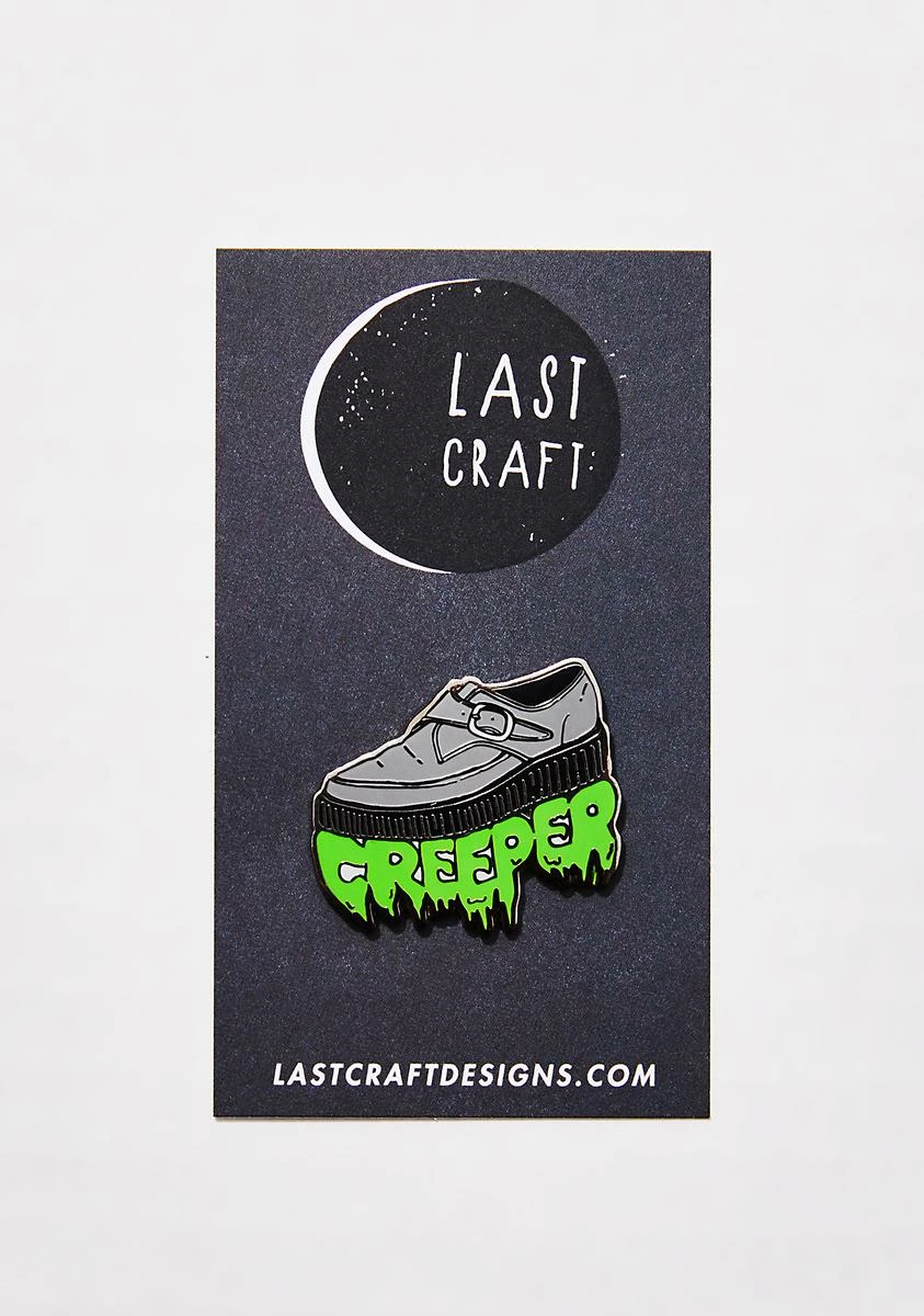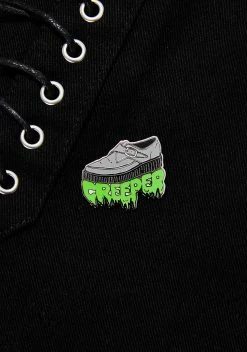 cuz ur always lookin’ N’ lurkin’. This pin has a creeper shoe shape, slimey “CREEPER” text underneath, and a pin back closure.