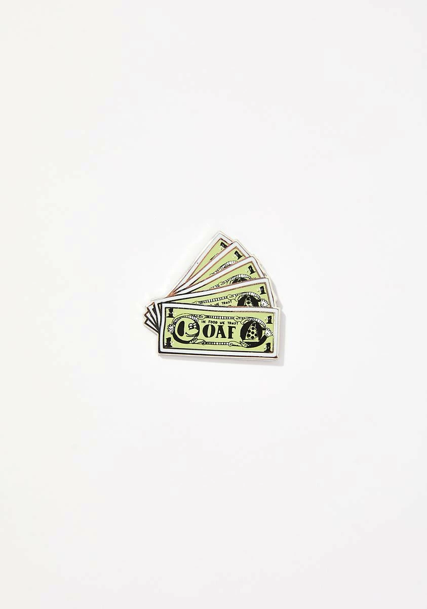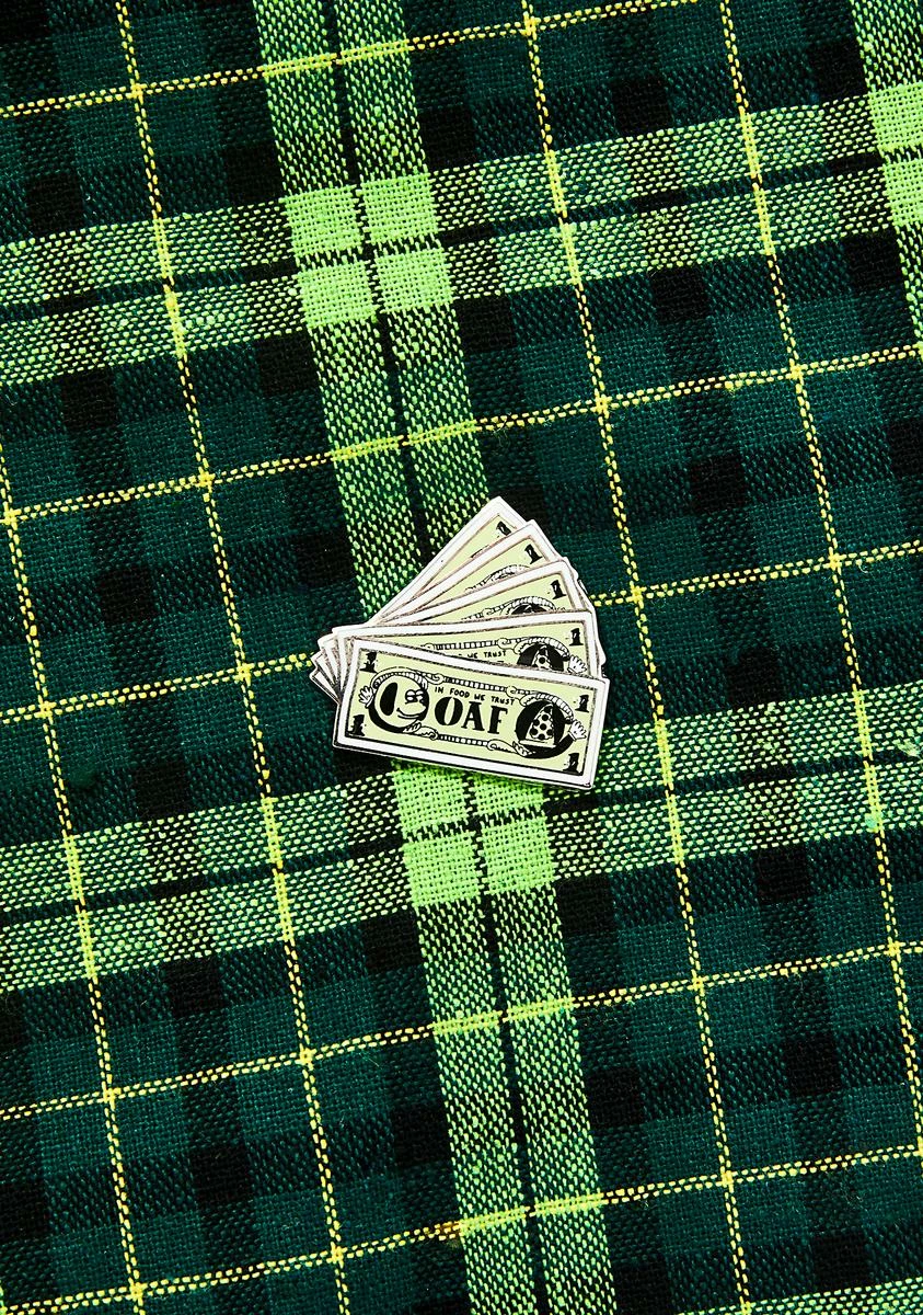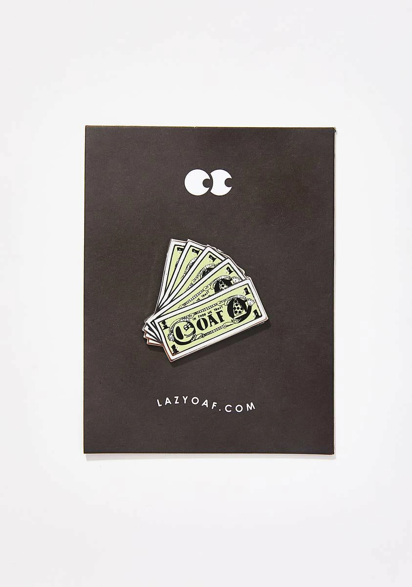 Give her some money! This schmoney pin has five bill details on the front and a pin back closure.