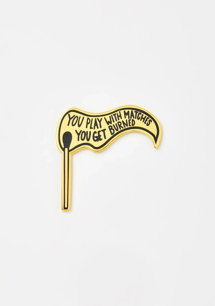 cuz when ya play with matches, ya get burned. Get yer pyro on with this sikk pin that has a flamin’ match design and button closure.