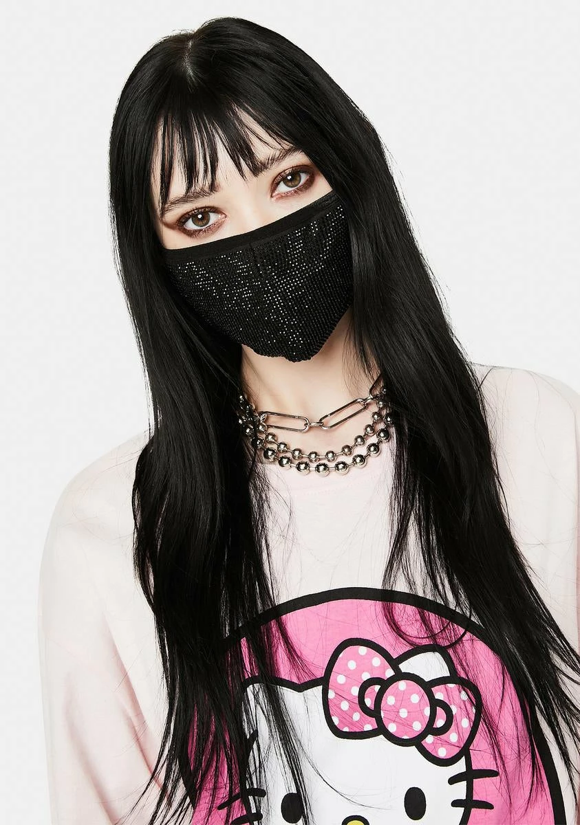 has shimmering black rhinestones all over and adjustable elastic ear loops for a secure and comfy fit.