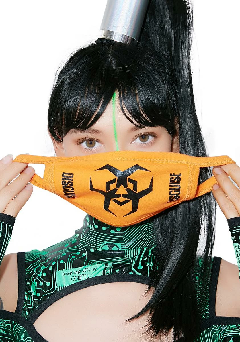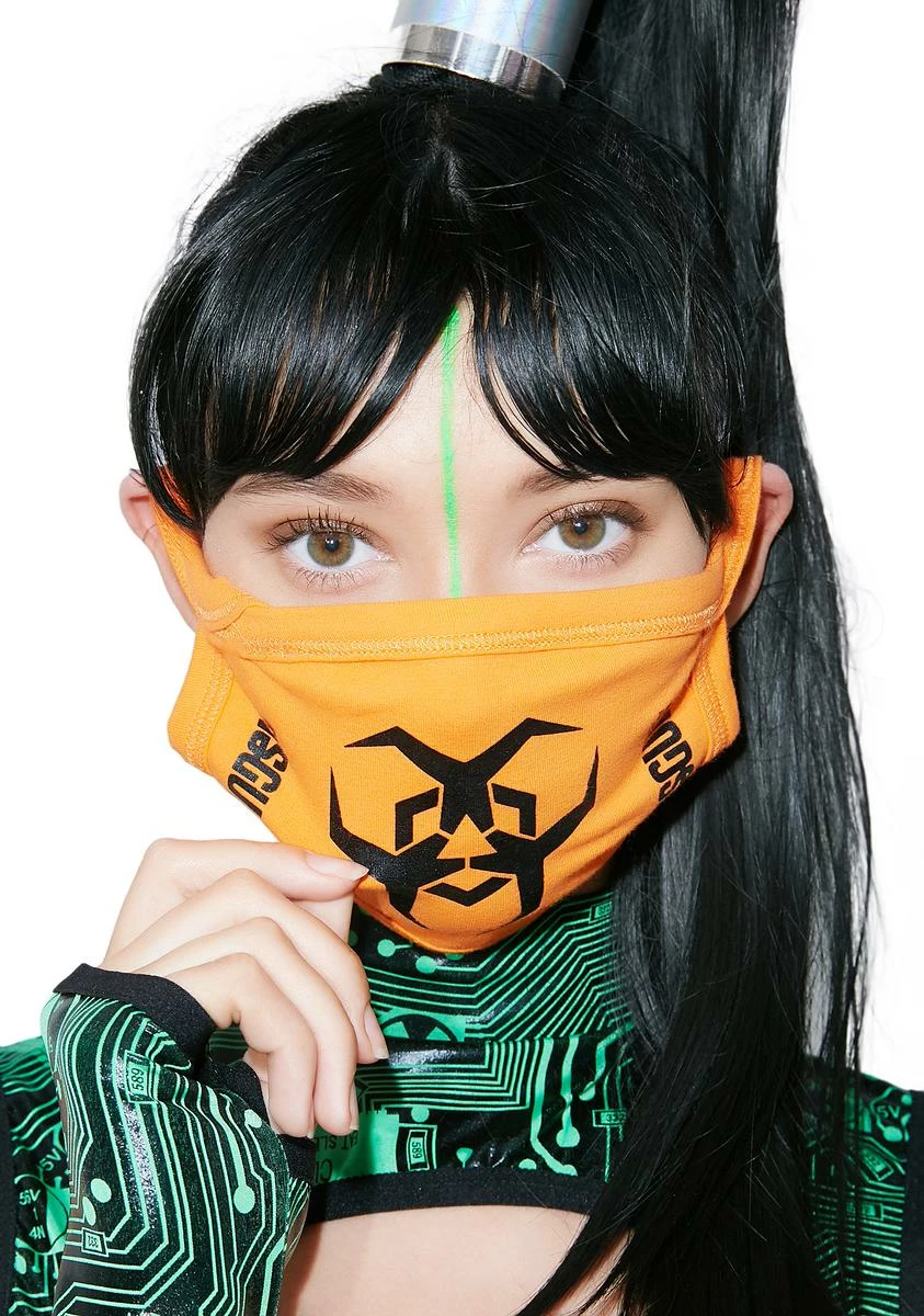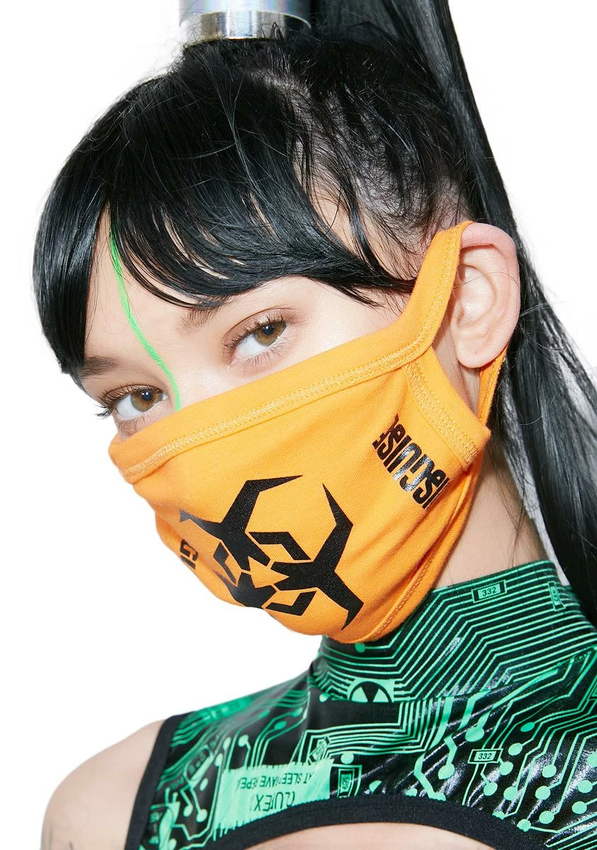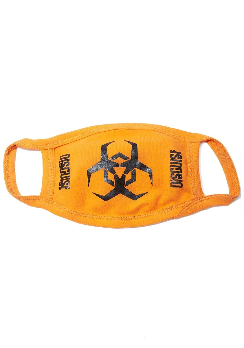 cuz you can be deadly. This orange face mask has a biohazard symbol on the front and straps that comfortably wrap around your ears.