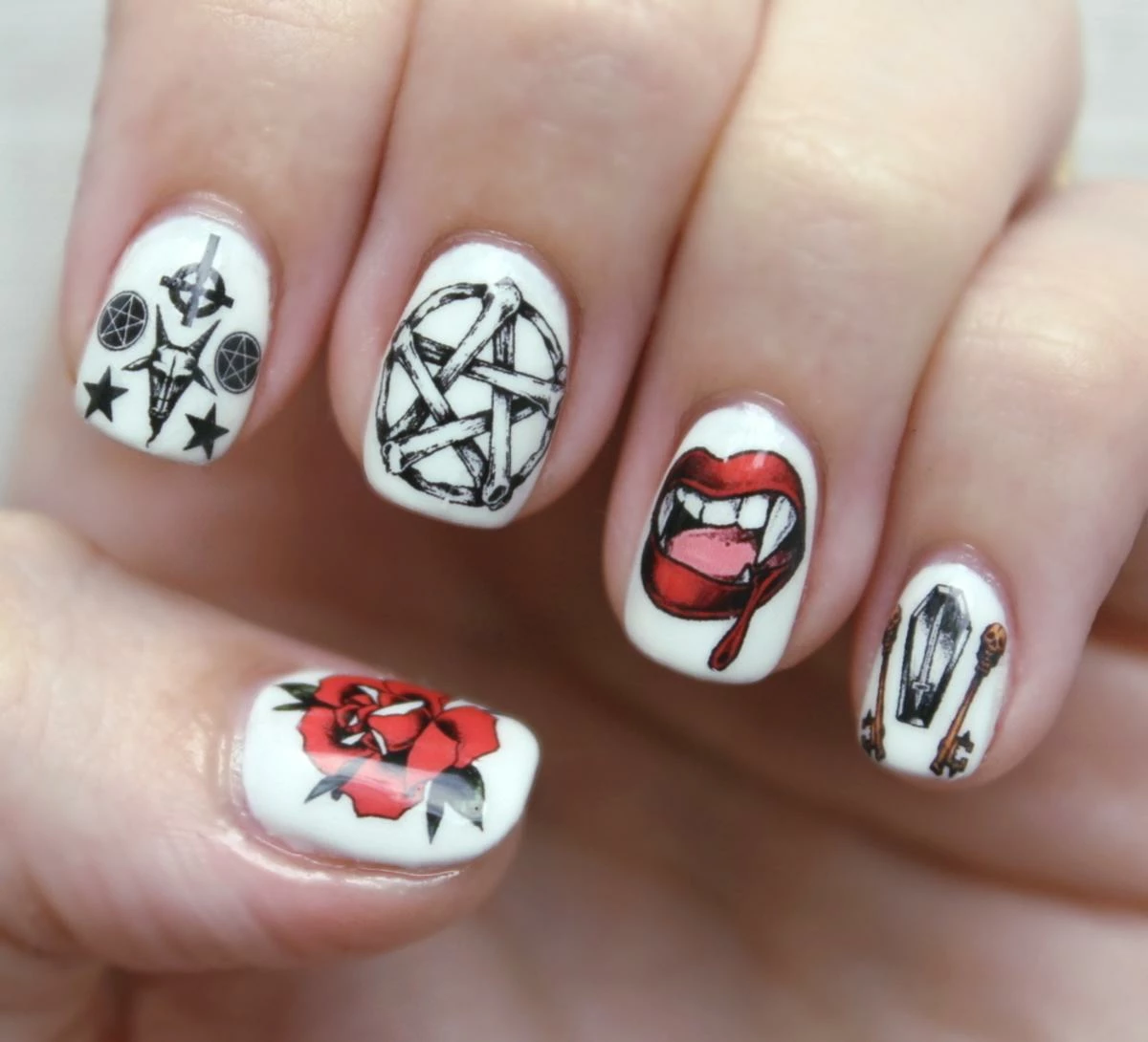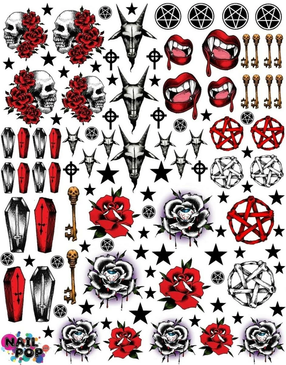 Nail Pop X Dolls Kill Hail, Hail! Nail Decal, all hail the queen of darkness. These xXxclusive collaboration nail decals were conceptualized by Erin Hart just for you dolls. These BBZ are so easy to apply, just cut out the design you want and place it in water for 15-20 seconds, then remove from the water with tweezers. Slide off the paper backing, and place the decal on yer nail where you want it, then paint over a few times with a clear top coat. With tons of individually illustrated prints to choose from, including pentagram, baphomet, roses, skulls, and even skeleton keys, give ‘em the royal treatment- even if it’s with one finger in the air.
