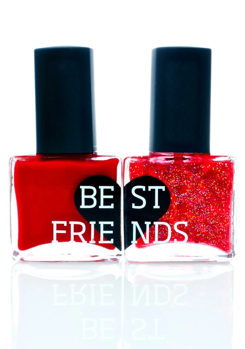 yer a match made in heaven! This supa sweet nail polish set features a classikk, creamy red and a hyper glittery red topper with heart shaped confetti for an ultra lovey-dovey mani-pedi~