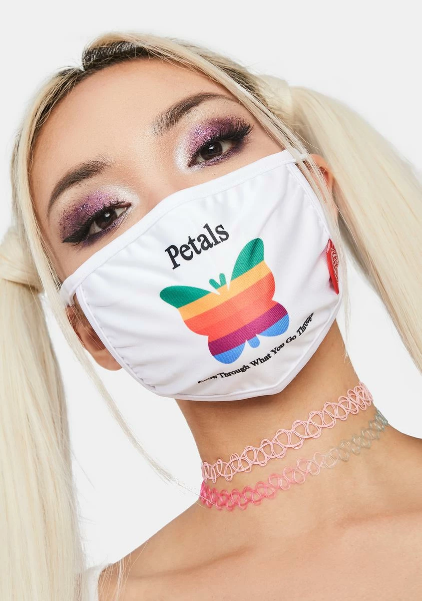 this protective face mask has two layers, a rainbow butterfly graphic and text that reads “Grow Through What You Go Through”.
