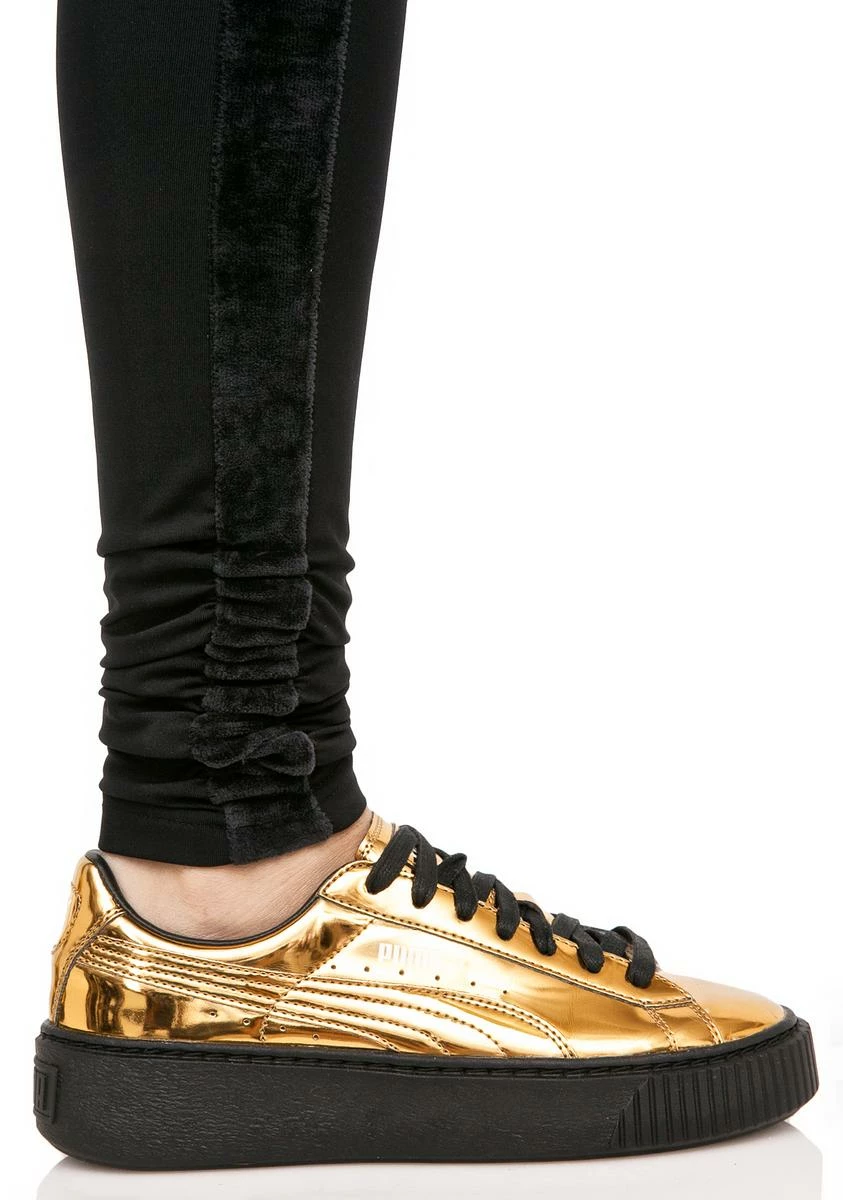 we need that 24 karat magic right now, bb! These dope metallic sneakers feature a luxxxurious golden vegan patent leather construction, signature striping on the sides, thick black creeper-style platforms, and contrasting black lace-ups.