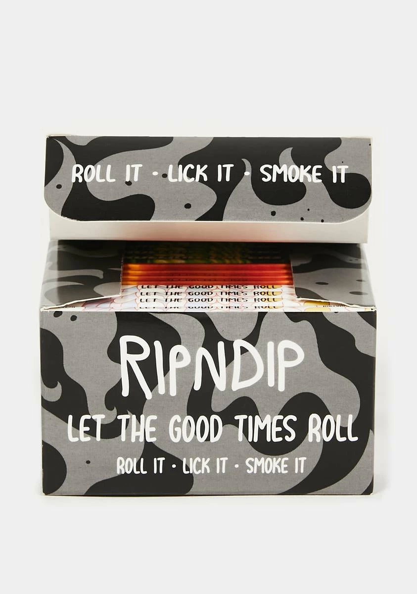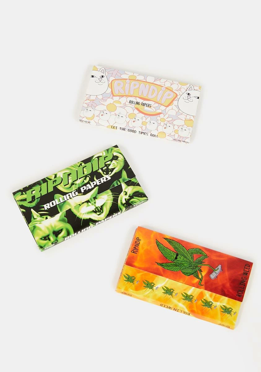 includes four packs each of three different printed rolling paper designs, including a floral print, a Ripndip logo print, and a kitty print.