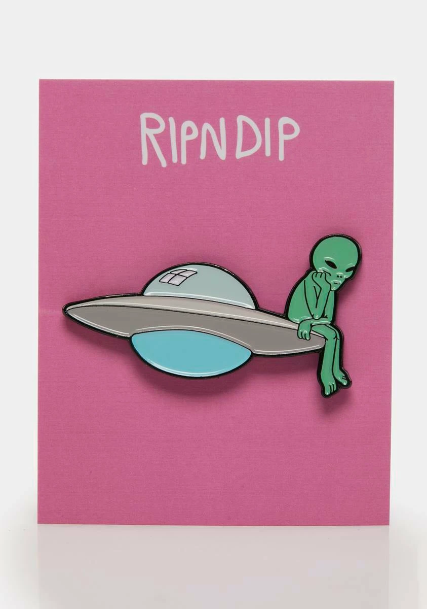 new day, same problems. This enamel pin has a deep-thinking alien and spaceship at front and double posts with rubber clasps at back.