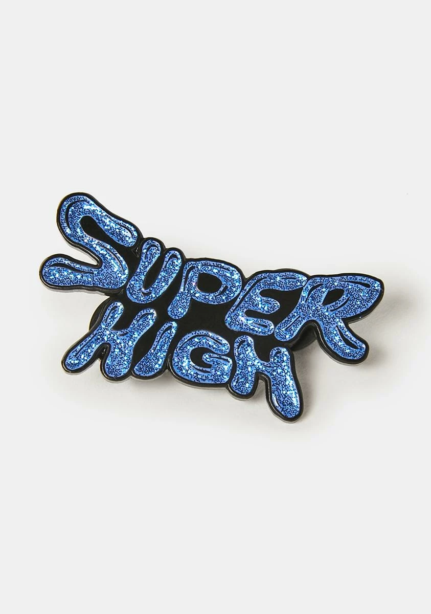 cuz kiss the sky. This enamel pin has a glitter word graphic and a rubber clasp at the back.