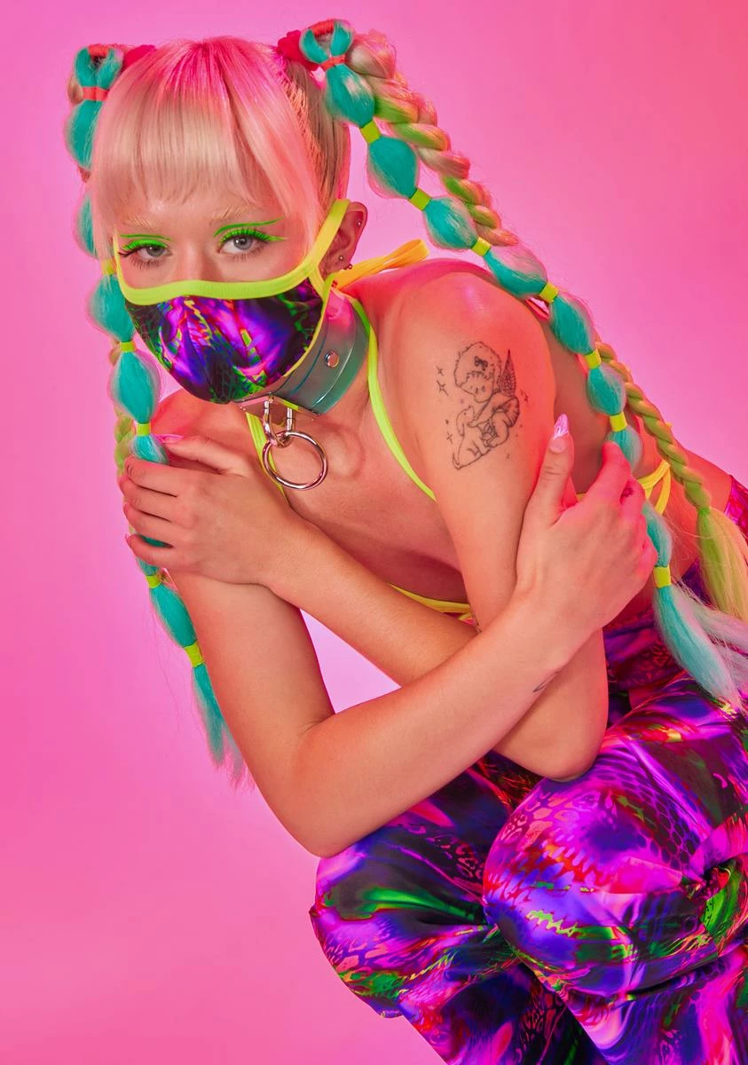 welcome to an alternate reality. This stretchy face mask has UV reactive piping and an electric jungle print all over.