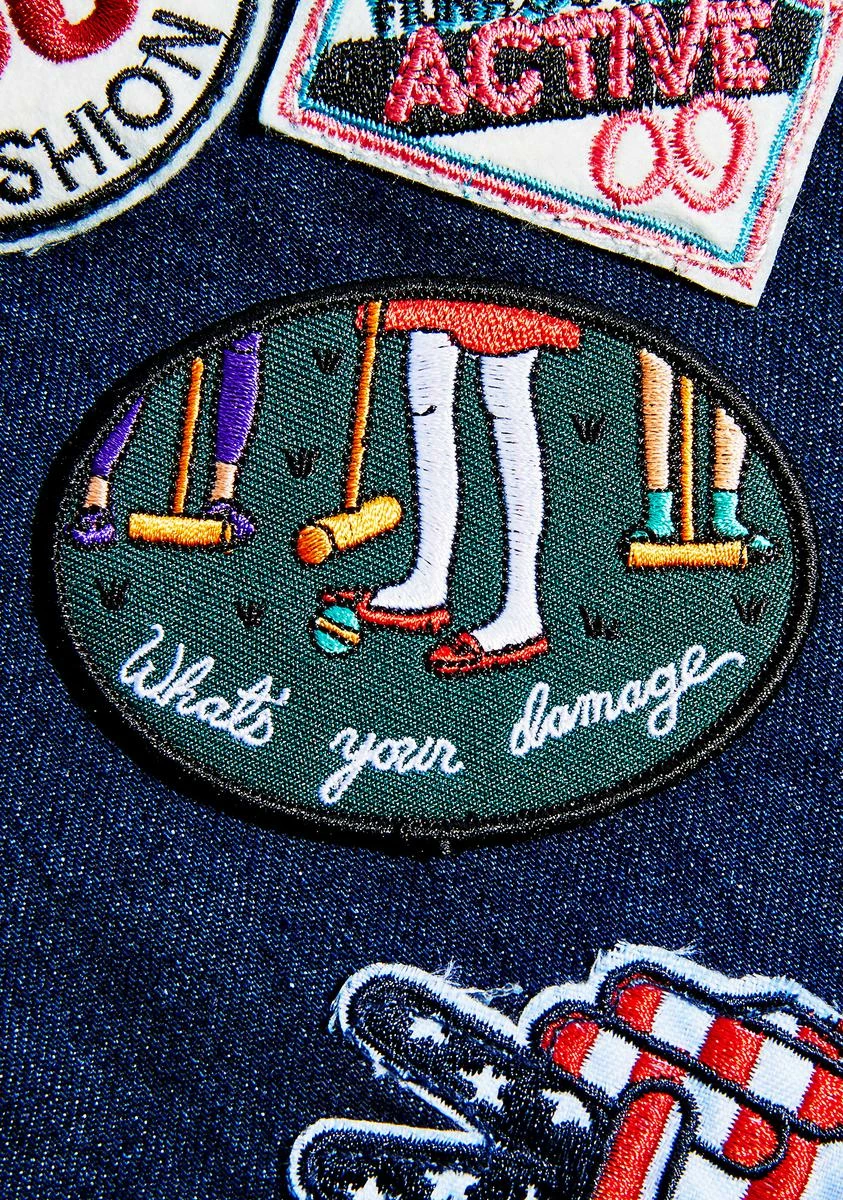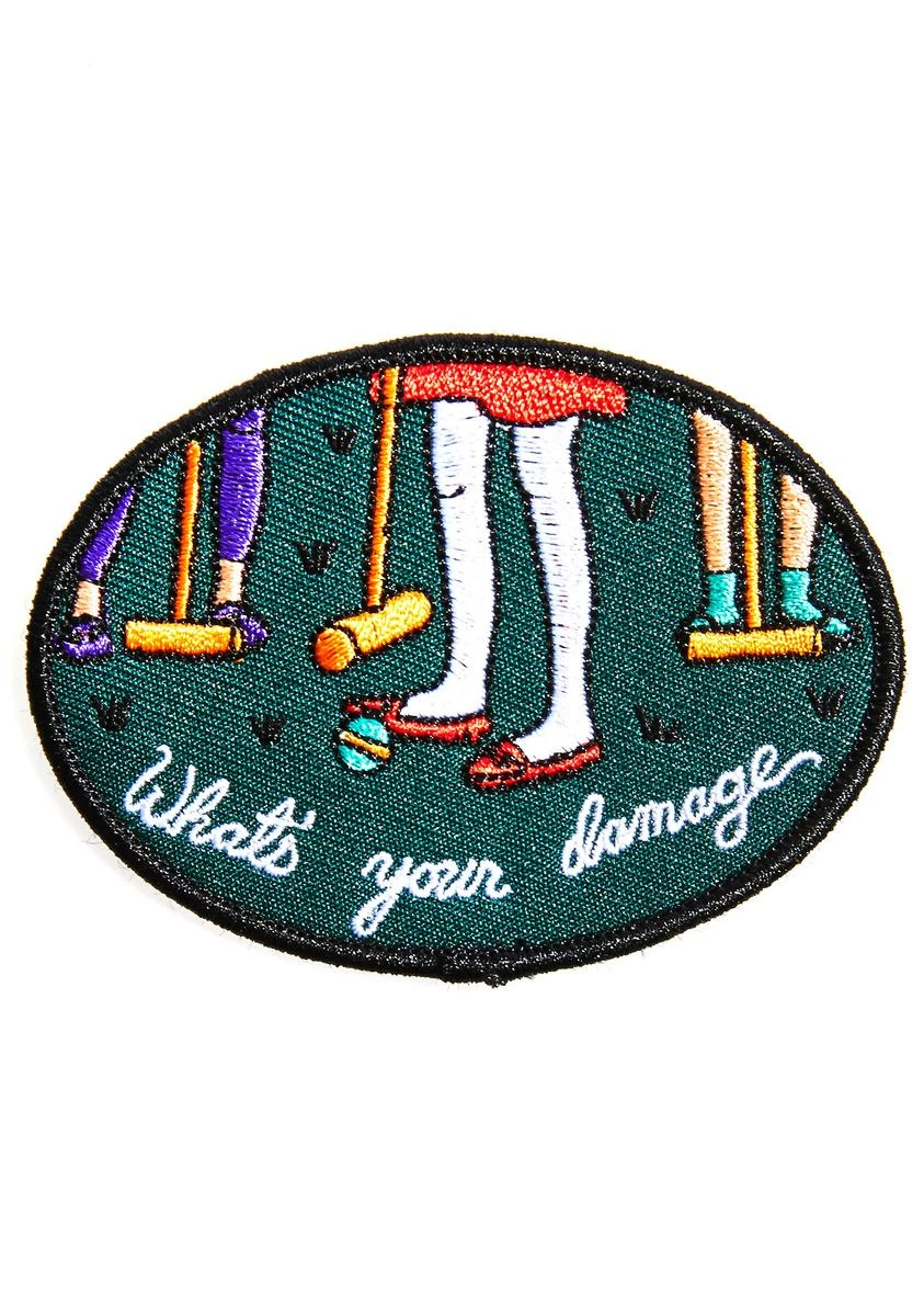 cuz yer in the clique now, b!tch. This dope oval patch features a buncha gals playing croquet with cursive lettering reading ‘What’s Your Damage.’