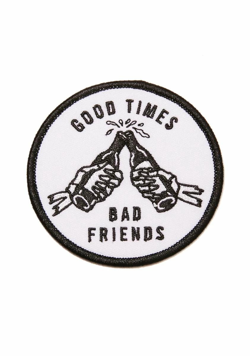 let the good times roll, bb! This iron-on patch features an embroidered construction, skeletal hands N’ beers and print that reads “GOOD TIMES BAD FRIENDS”.