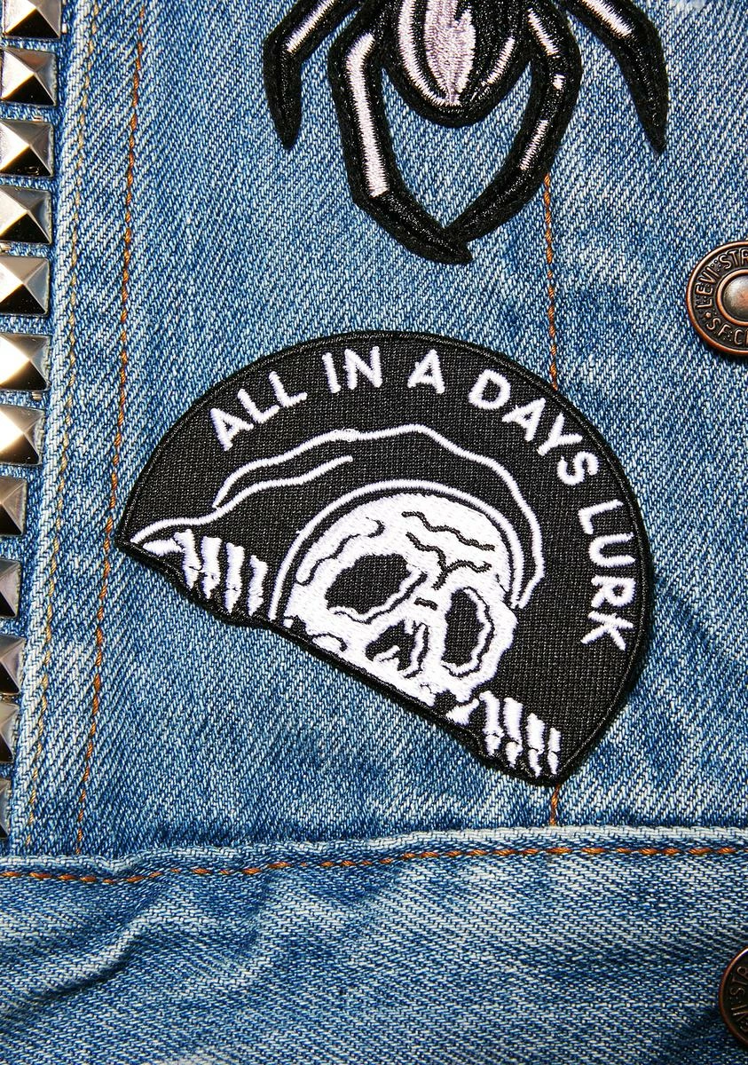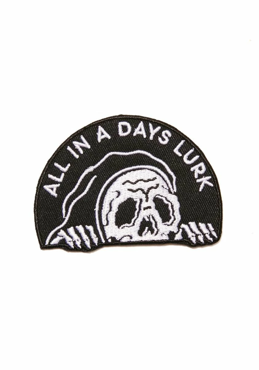 keep on creepin’ on, baby! This iron-on patch features an embroidered construction, lurky Grim Reaper and print that reads “ALL IN A DAYS LURK”.