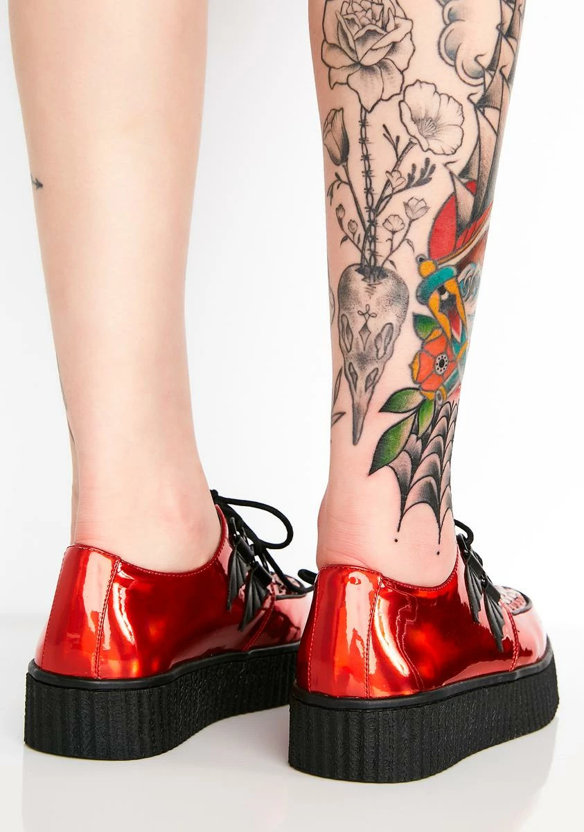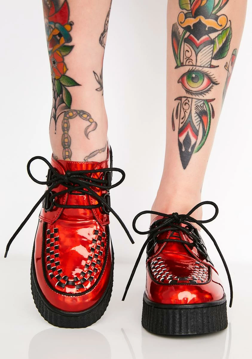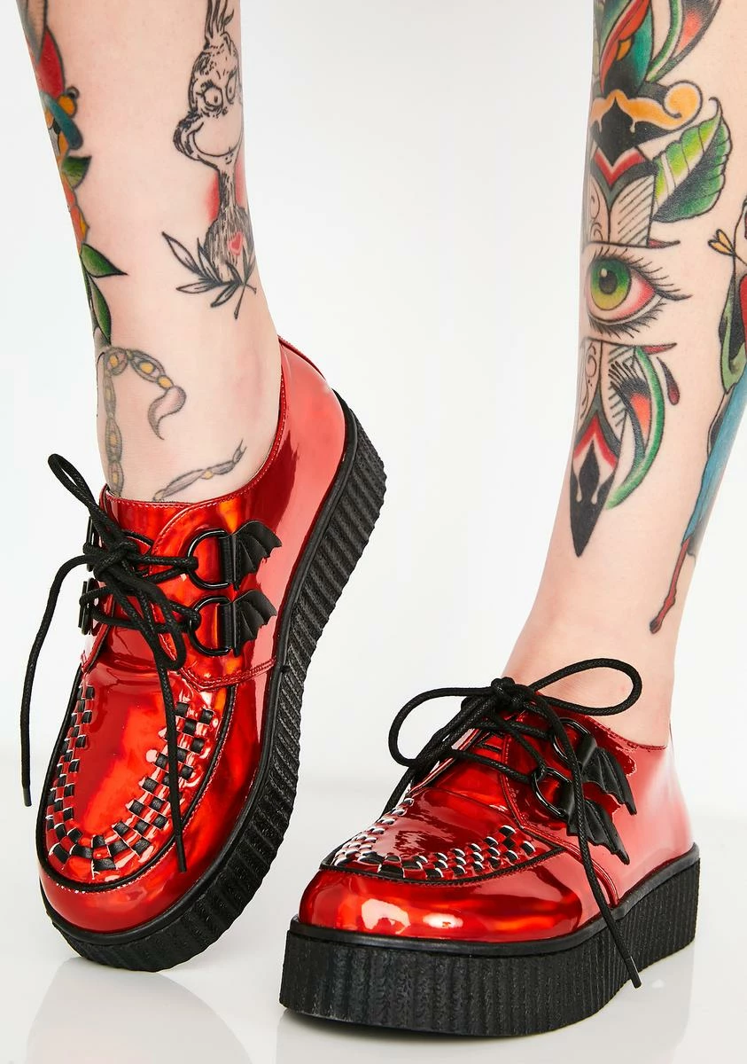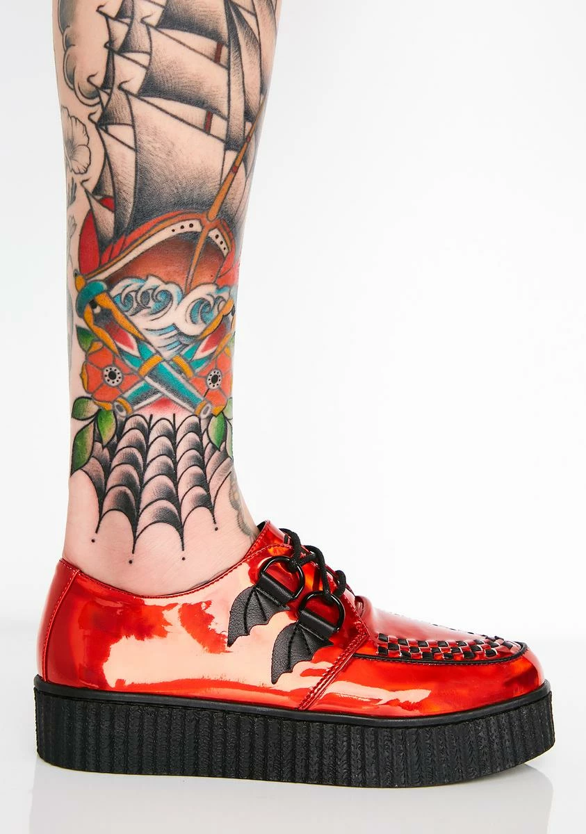 cuz youΓ’ΒΒre like a bat outta hell babe! Gone by the time morning comes in these dope red hologram kreepers that have lil bat details on the sides, woven details on the uppers and lace up closures.